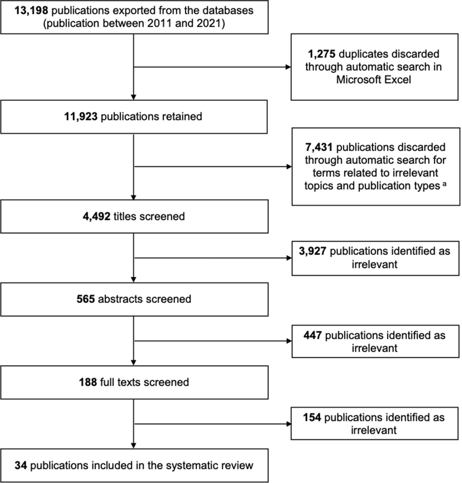 Flow diagram of the publication screening process. The search in databases was conducted between October and December 2021. We adapted the method that Kugler et al. (2018) applied and used conditional formatting and filtering in Microsoft Excel to detect specific terms. Publications with at least one of the following terms in the title or abstract as well as publications not presenting academic journal articles were discarded: child, infant, pupil, adolescent, primary school, elementary school, secondary school, middle school, high school, disorder, addiction, disease, illness, diabetes, cancer, disability, disabilities, depression, psychosis, schizophrenia, psychotherapy, forensic, diet, patients, drug, medication, wound, motor learning, physical education, sport