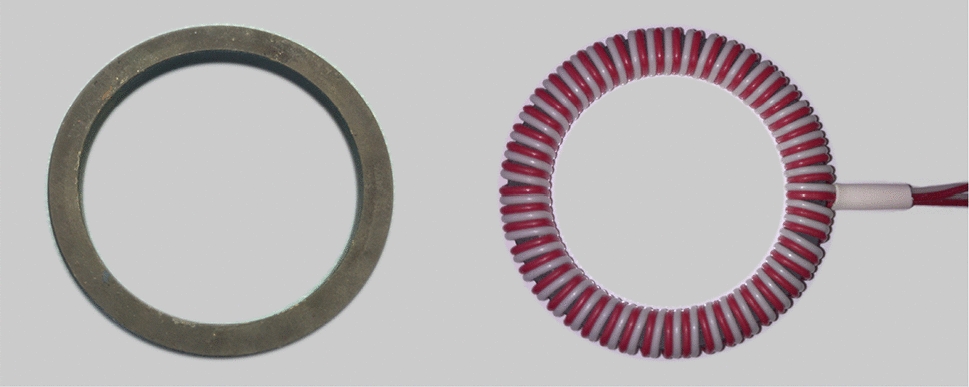 To minimize the side effects associated with the shape and geometry (e.g., demagnetization effect, field inhomogeneities, etc.), magnetically closed ring shaped specimens made of commercial low-carbon steel (C<0.06%, Mn<0.45%, Si<0.15%, Al<0.02%, P<0.02%, S<0.02%) were used for the verification of fundamental ideas of MAT, see Fig. 2. Average ring dimensions were: outer diameter \(D \approx 56\) mm, inner diameter \(d \approx 46\) mm, and height \(h \approx 5\) mm. The material was subjected to successive annealing at the temperature of 753 K for 2, 4, 6, 20, 40, and 60 h. Thus, an artificial aging, associated with long-term exposure to elevated temperatures, was simulated. The relatively low temperature was chosen in order to test the limits of MAT capabilities, since at such low temperatures (far bellow critical one for the steels) no significant variations in microstructure are expected. Therefore, any changes indicated by MAT parameters are believed to be caused mainly by residual stress removal. Nevertheless, even in the range of 753–793 K (i.e., 480–520 °C) the primary recrystallization in the wires of a similar composition was observed [14]. Between each annealing step, the dimensions of samples were checked again, and a set of magnetization curves at the same excitation conditions (as required for MAT) was measured. In order to keep the winding geometry and, especially, the number of turns the same during the experiments, both primary and secondary coils were wound at the same time (two-wire flat cable was used).