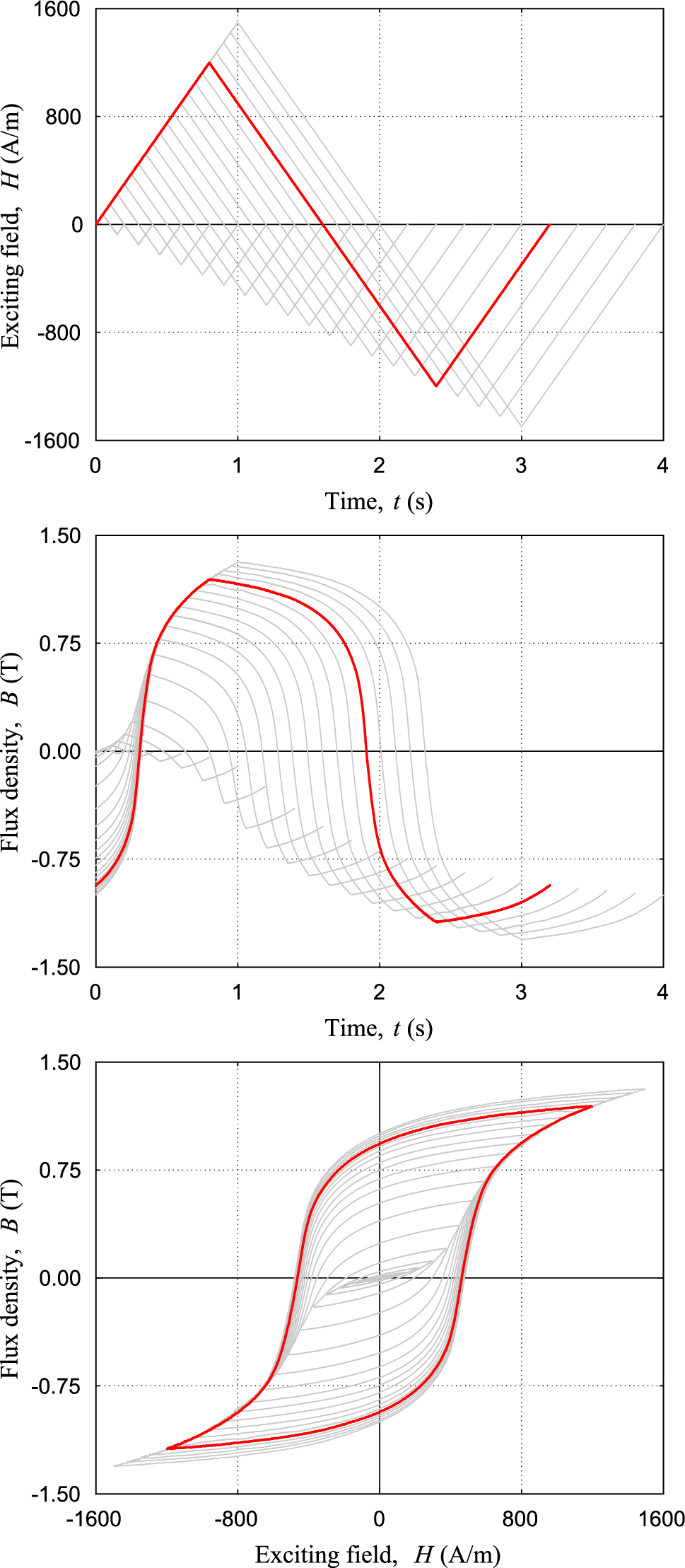 Examples of experimentally obtained waveforms of the exciting field H(t) (top), corresponding flux density B(t) (middle), and minor hysteresis loops B(H) (bottom)