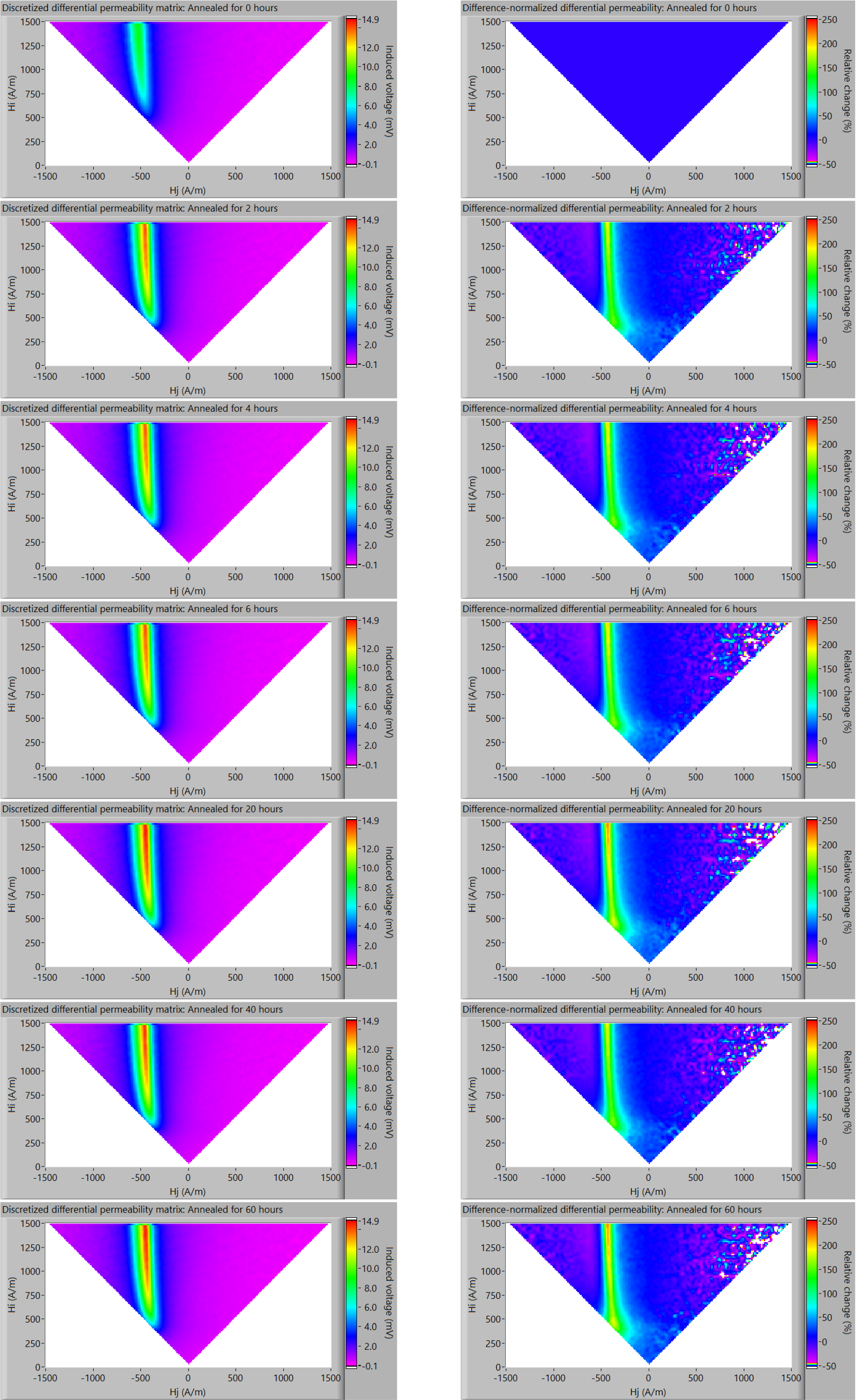 The evolution of differential permeability with annealing time \(t_{a}\) is shown in Fig. 6. The values of interpolated discretized induced voltage, displayed as colored triangular matrices, were obtained by the procedure described in Sect. 2.2. The relative difference matrices of \(\Delta \mu _{i,j,k}\) were calculated using (9), see Sect. 4.1. The upper left matrix representing the initial state for \(t_{a}\) = 0 was used as the reference.