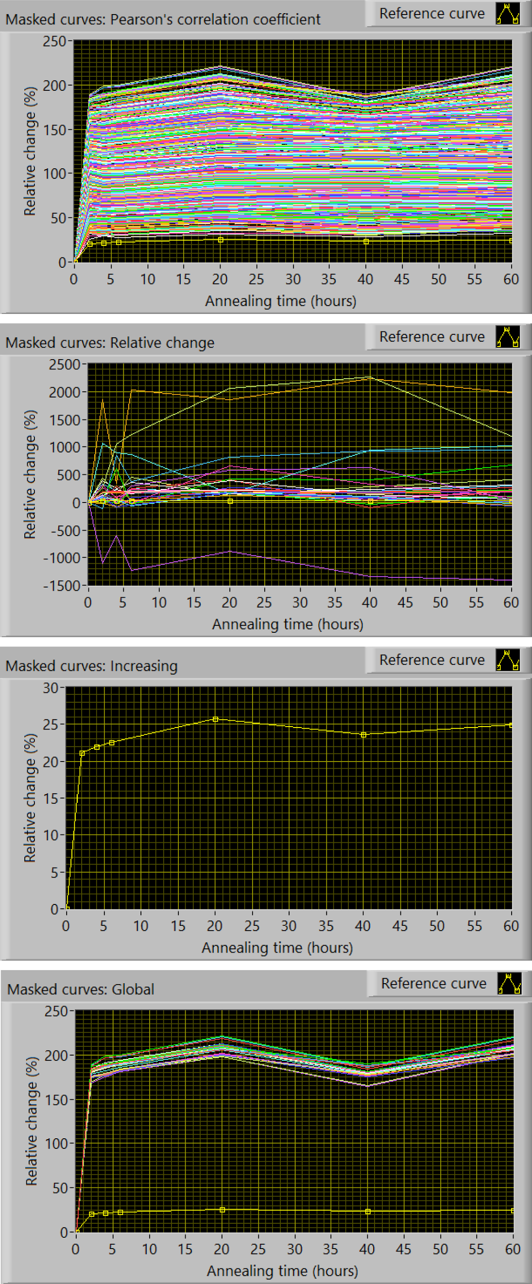 If the coercive field dependence \(H_{c}(t_{a})\), blue curve in Fig. 8, was used as the reference curve, there was no overlapping found among individual masks. Therefore, the global mask, computed again as a logical AND of the elements of all the partial masks taken into account, contains no TRUE values. The only interesting test is thus based on the correlation coefficient, using which several tens of curves with similar shape were found. In this case, the relative changes achieved about \(-25\%\), which is only slightly better comparing to the reference curve with \(-20\%\).