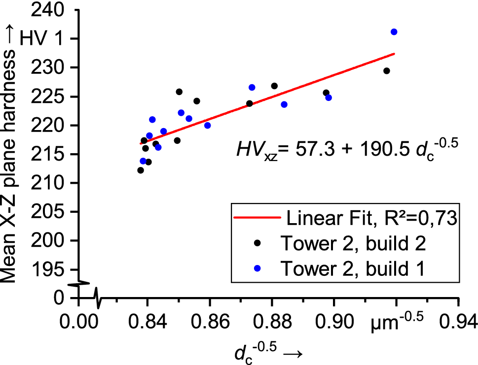 The above relationships can be used to correlate the cooling rate to the hardness. The mean cell size is estimated by Eq. (6) using the mean cooling rate measured for the layer. A Hall–Petch type curve, Eq. (8), is fitted using the estimated mean cell size and the mean hardness of each layer, to demonstrate the validity of the measured cooling rates.