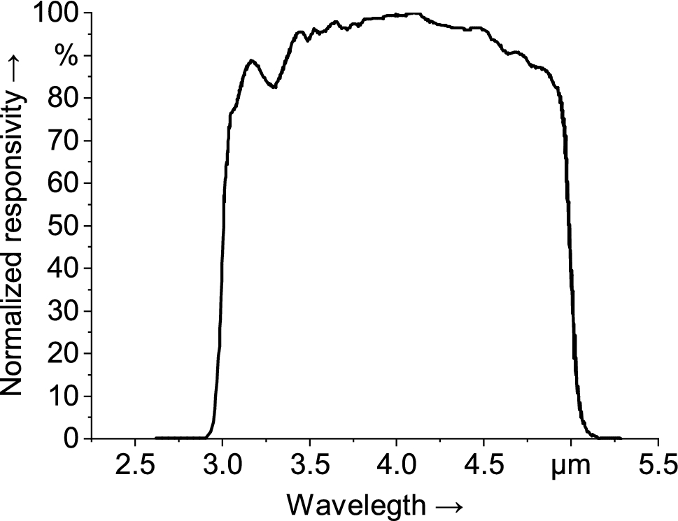The optical access to the chamber was through a germanium long-pass filter window (Edmund Optics, Nether Poppleton, North Yorkshire, UK). The filter had a diameter of 50 mm and a transmission of > 85% in the spectral range of the camera. The setup covered a field of view (FOV) of \(160~\textrm{mm}~\times ~153~\textrm{mm}\) with a maximum resolution of \(640~\textrm{pixels}~\times ~512~\textrm{pixels}\). Increasing attenuation of the impinging radiation occurred toward the outer bounds of the FOV due to atmospheric attenuation and the clear aperture of the viewing window. The correction of this vignetting effect is beyond the scope of this study. For this reason, the effective FOV was reduced to \(384~\textrm{pixels}~\times ~312~\textrm{pixels}\). The size of this area was evaluated by viewing a black body plate at a constant temperature of 353 K. The frame rate was set to 1620.67 Hz. The integration time of the camera was set to 0.0103 ms in accordance with the calibration of the manufacturer.
