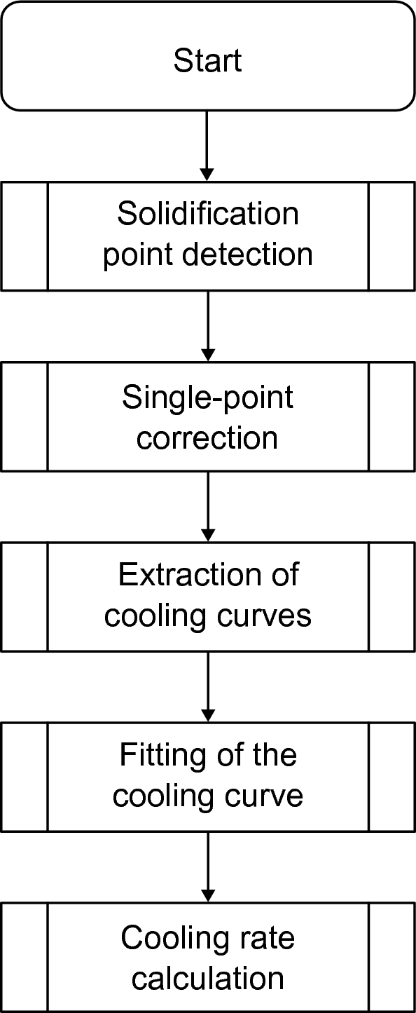 This methodology employs a statistical data analysis to ensure the reliability of the measurements. In the first step of applying this methodology, the signal value of the solidification temperature was detected for each layer. This information was used to calculate the apparent emissivity at this temperature and to perform a single-point correction of the data. The cooling cycle after the solidification of each pixel was extracted from the corrected data. The cooling curve was obtained by fitting the extracted data to a simplified analytical temperature model. In the final step, the solidification cooling rate was calculated from the first-order derivative of the fitted cooling curve. The following subsections describe these five steps in more detail.
