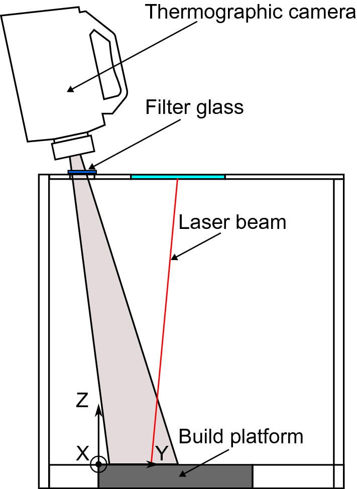 The camera was mounted on an aluminum frame outside of the process chamber. The camera was positioned at a working distance of 500 mm by means of a slider mount. The viewing angle was 14° to the Z axis and –5° to the X axis. Stoppers in the aluminum frame allowed the camera position to be reproduced in the various experiments.