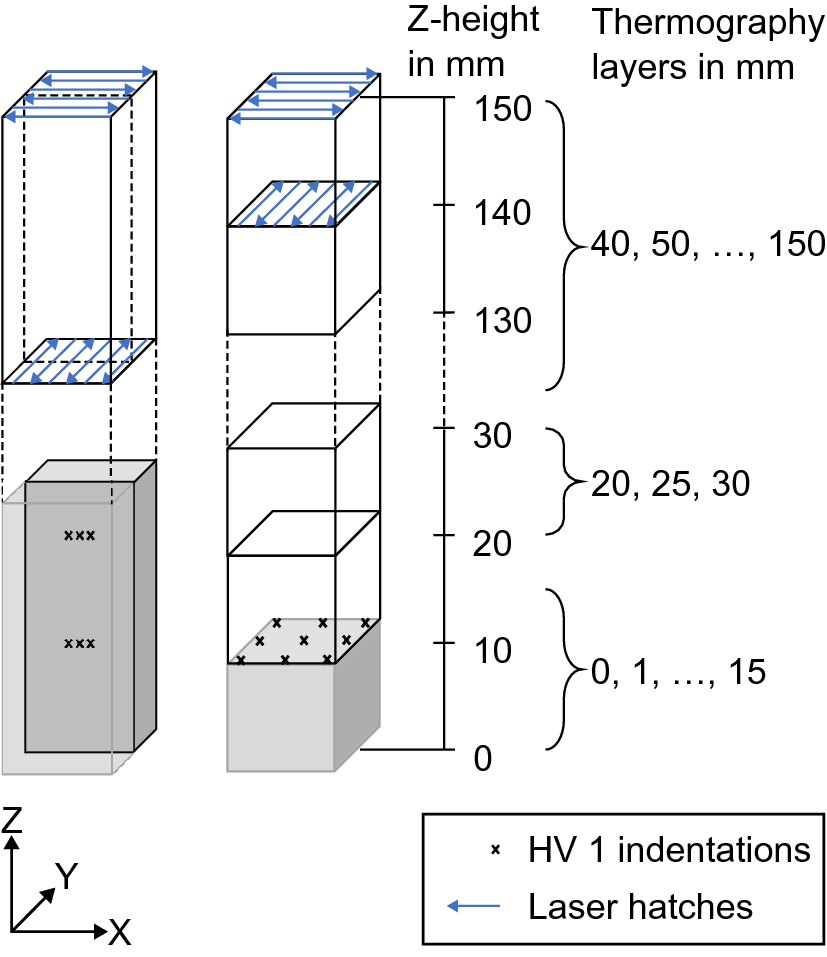This paper describes a methodology for measuring cooling rates during the PBF-LB/M process. A five-step data evaluation procedure was used to evaluate the cooling rates from in situ thermographic measurements. The methodology was tested using a large FOV thermographic setup mounted on an EOS M280. The setup enabled the observation of an area of \(96~\textrm{mm}~\times ~78~\textrm{mm}\) with a spatial resolution of 250 μm/pixel. To evaluate the reproducibility, four cubical towers of the dimensions \(10~\textrm{mm}~\times ~10~\textrm{mm}~\times ~150~\textrm{mm}\) were manufactured in two build jobs. The cooling rates were measured in several layers along the build height. The HV 1 microhardness profile was tested along the build height, perpendicularly and parallel to the building direction. The cooling rates and the mechanical properties of the parts were correlated using a Hall–Petch type relationship. The following conclusions can be drawn from the findings of this work: