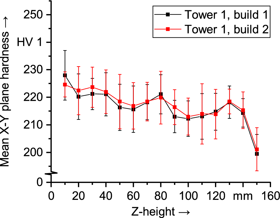 Figure 6 shows the hardness in the X-Y plane of the parts. The hardness decreased significantly with increasing height from 228 ± 9 HV 1 at 10 mm to 214 ± 5 HV 1 at 140 mm (ANOVA p value = \(3.59\times 10^{-8}\)). The value of the top of the towers at about 150 mm was lower, at 199 ± 7 HV 1.
