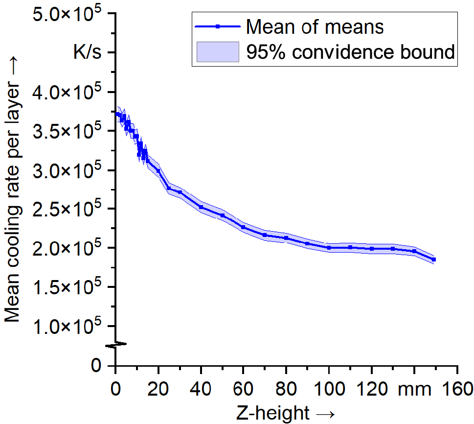 The mean cooling rate per layer decreased by 47% from \(3.72\times 10^5\) K/s at a build height of 1 mm to \(1.96\times 10^5\) K/s at a build height of 140 mm.