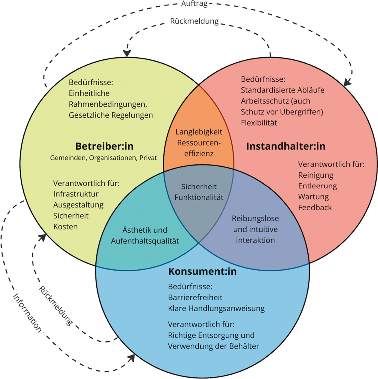 In den nachfolgenden Kapiteln werden die identifizierten relevanten Kriterien zur Ausgestaltung und zum Design von Abfallbehältern zusammengefasst und Empfehlungen ausformuliert. Dafür wurden die Informationen aus den gesammelten Daten (Tab. 1) vernetzt und durch bestehende Forschungsergebnisse ergänzt, um konkrete Handlungsempfehlungen für Entscheidungsträger:innen abzuleiten. Der Fokus liegt dabei auf der potenziellen Einführung einer getrennten Sammlung im öffentlichen Raum. Die Empfehlungen zur Gestaltung der Infrastruktur wurden entlang von Designprozessen wie User Centered Design und Designmethoden wie Design Research abgeleitet und adressieren sowohl funktionale als auch ästhetische Anforderungen. Wie in Abb. 2 dargestellt, wurden dabei die Bedürfnisse von Betreiber:innen (also z. B. Gemeinden oder Privatfirmen, die u. a. für die Bereitstellung der Infrastruktur verantwortlich sind), von Instandhalter:innen (zuständig für die Entleerung, Reinigung etc.) sowie die Ansprüche von Konsument:innen berücksichtigt. Ein partizipativer Ansatz, der alle Akteur:innen einbezieht, ist empfehlenswert, um Kernbedürfnisse und potenziell gegensätzliche Anforderungen an die Abfalltrennbehälter zu identifizieren. So können fundierte Entscheidungen über die Platzierung und Gestaltung der Abfalltrennbehälter getroffen werden. Zum Beispiel ist es bei der Einführung neuer oder der Anpassung bestehender Systeme entscheidend, Reinigungs- und Wartungspersonal als Expert:innen aktiv in die Planung einzubeziehen. Dies ermöglicht die Berücksichtigung wertvoller Erkenntnisse und Erfahrungen in Bezug auf das Abfallaufkommen, die Arbeitssicherheit und den Arbeitsablauf bei der Entleerung, Wartung und Reinigung (Qual_2, Qual_5).