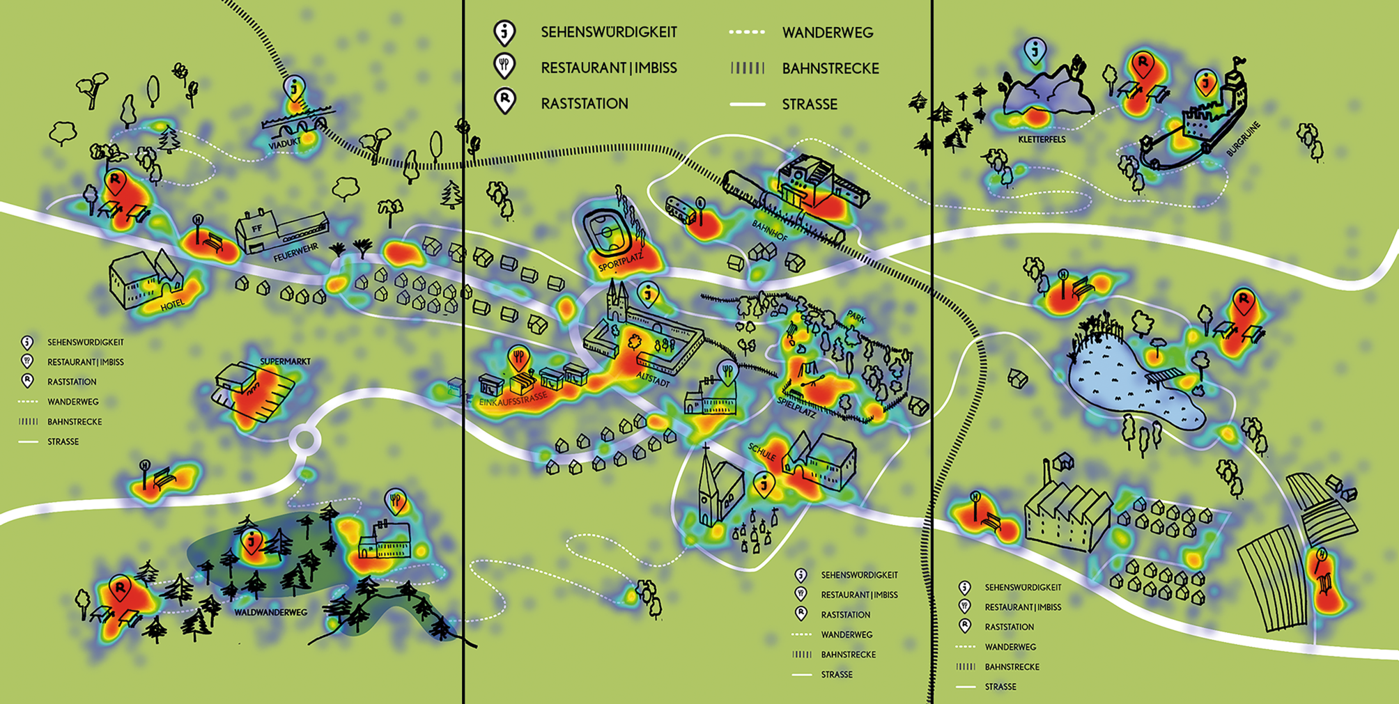 Konsument:innen suchen Abfallbehälter anhand einer inneren Landkarte (Qual_2). Selbst wenn Konsument:innen mit der Umgebung nicht vertraut sind, entwickeln sie ein Bauchgefühl, wo sie bestimmte unbelebte Objekte (wie beispielsweise Abfallbehälter) erwarten können. Dies sind vor allem frequentierte Stellen wie Ein- und Ausgänge, bei öffentlichen Toiletten und an Haltestellen sowie Orte, an denen aktiv konsumiert wird, zum Beispiel bei Sitzgelegenheiten oder Tischen. Diese eigenen sich folglich als Standorte für Abfallbehälter. Außerdem wurde erhoben, an welchen Stellen auf einer fiktiven Landkarte die Befragten einen Abfallbehälter mit Mülltrennung (z. B. für Papier, Plastik, Metall) erwarten würden (Quan_2). In der dazugehörigen Heatmap (siehe Abb. 3) wird mit einer Farbskala visualisiert, an welchen Punkten auf der Karte die meisten Personen (Stichprobengröße: 2340) geklickt haben. Es zeigt sich, dass Trennsysteme vor allem bei Gebäuden (insbesondere Eingängen), Haltestellen, Rastplätzen sowie bei Straßenkreuzungen erwartet werden (Quan_2). Zudem scheint es sinnvoll, sich bei der Einführung von Trennbehältern zunächst auf Abfall- und Konsum-Hotspots zu konzentrieren, an denen ein besonders hohes Potenzial zur Wertstoffsammlung besteht. Dazu zählen u. a. stark frequentierte Bahnhofsplätze, Fußgängerzonen und gastronomische Bereiche (Gangl et al. 2022; Quan_5).