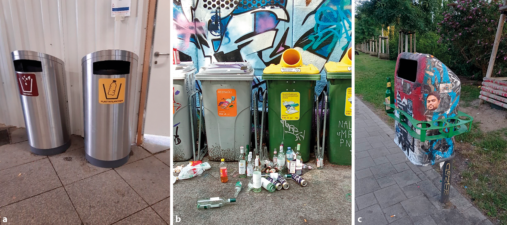 Beispiele für öffentliche Trennbehälter (a Trennbehälter mit Überdachung und Aschenbecher, b Trennbehälter mit verschiedenen Öffnungsformen pro Abfallfraktion, c Trennbehälter mit Überdachung und seitlichem Einwurf sowie Kennzeichnung von Trennfraktion mit „erlaubten“ und „nicht erlaubten“ Abfällen (Kladnik 2024; Qual_8))