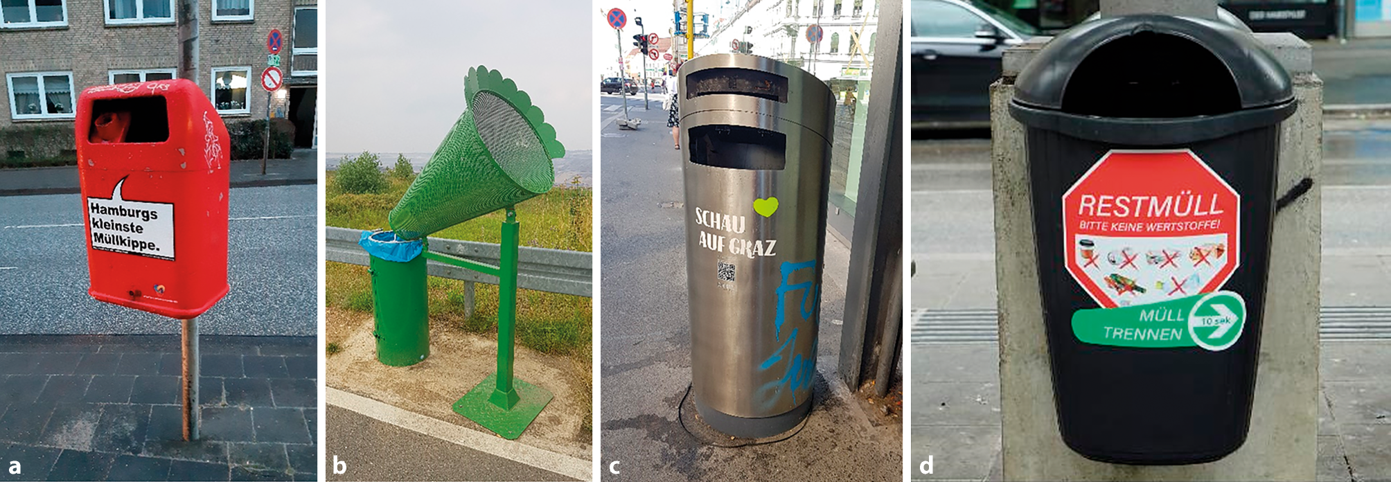 Beispiele für öffentliche Abfallbehälter mit zusätzlichen Elementen. (a Hängeabfallbehälter in Hamburg mit humorvollem Spruch, b Restmüllbehälter mit „übertriebenem“ Einwurftrichter auf einem Besucherparkplatz, c „Abfallhai“ für Restmüll mit Umweltmessage (Kladnik 2024, Qual_8), d Hinweisschild auf Restmüllcontainer zur Abfalltrennmöglichkeit (Kladnik et al. o.J. in Ausarbeitung))