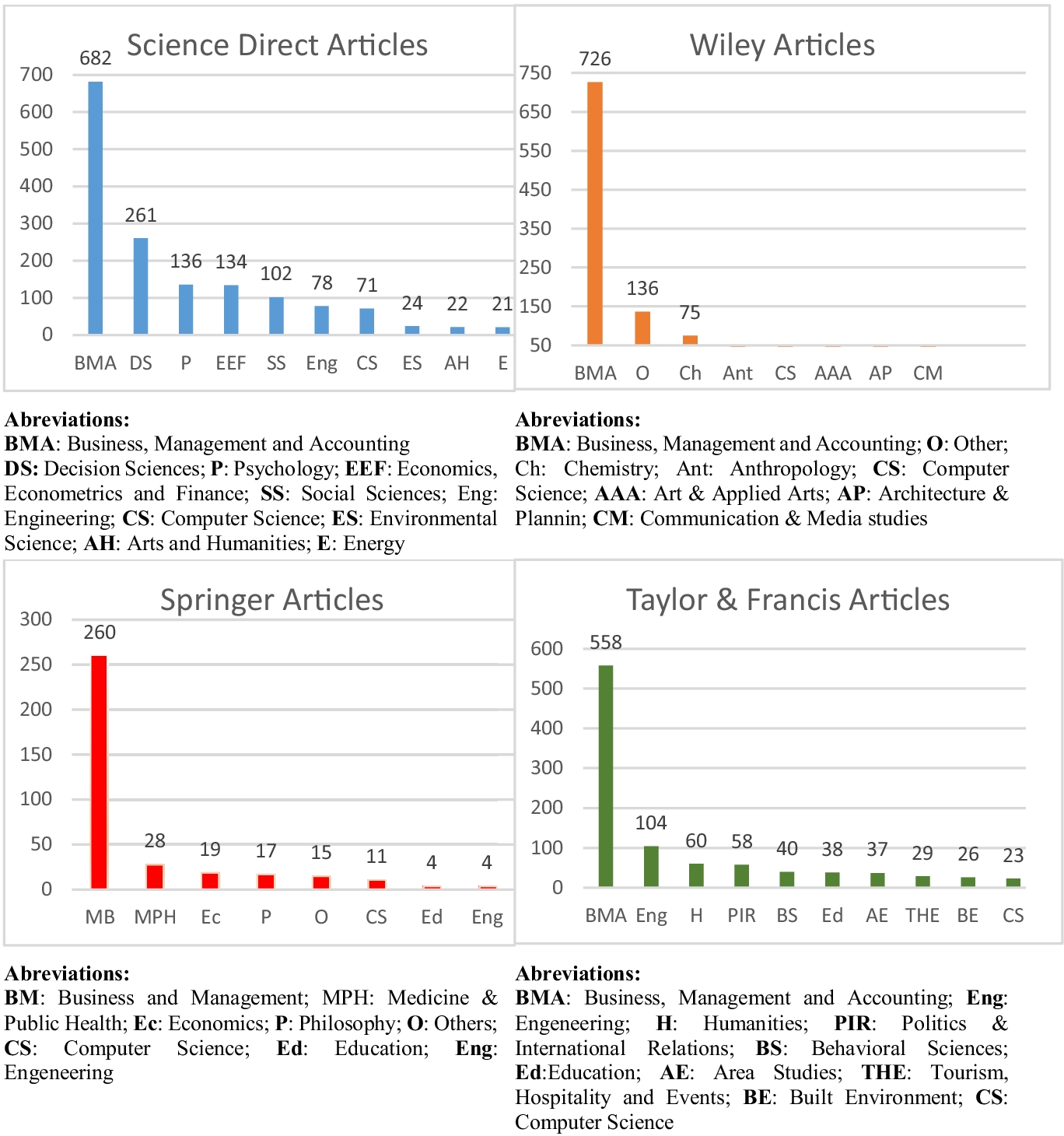The identification of the relevant literature was conducted on the following databases of recognized validity: Elsevier (Science Direct), Springer, Wiley, and Taylor & Francis. These Publishers have recognized prestige in the area of economics and management (Giménez-Toledo & Tejeda-Artigas, 2015). To identify relevant studies on these databases, a search for scientific articles that used the combined terms of “ambidexterity + innovation” in the period from 2000 to 2020 was performed. Articles from conferences, books, or any other scientific publication different from journal articles were excluded. As it can be seen in Fig. 2, the area that has generated the most articles was Management, with 2,226 articles in the last 20 years.