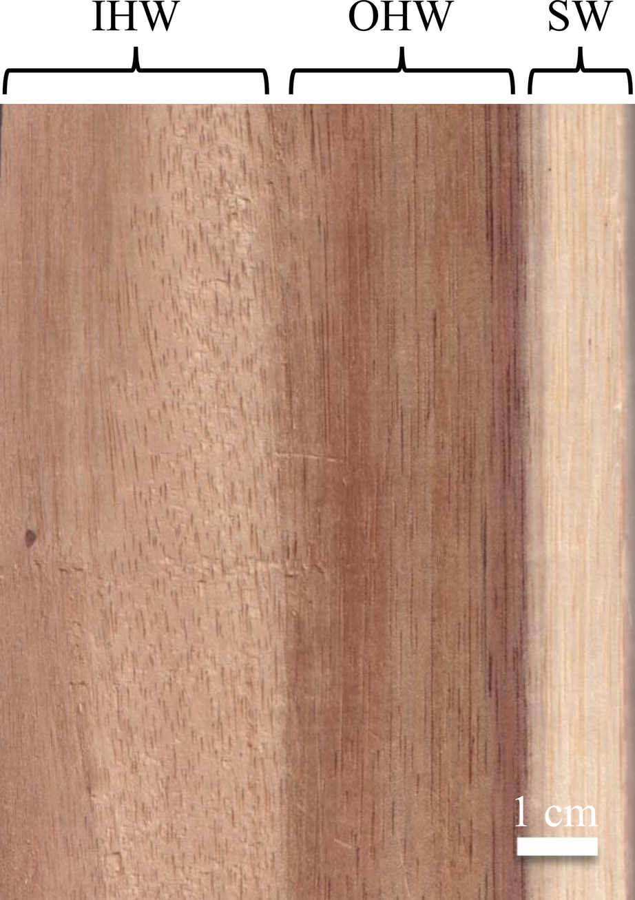 Differences in the color of inner and outer heartwood for the third-generation A. mangium. IHW, inner heartwood; OHW, outer heartwood; SW, sapwood. This radial board was scanned from family ID 33 of sub-line D (Masendra et al. 2024)