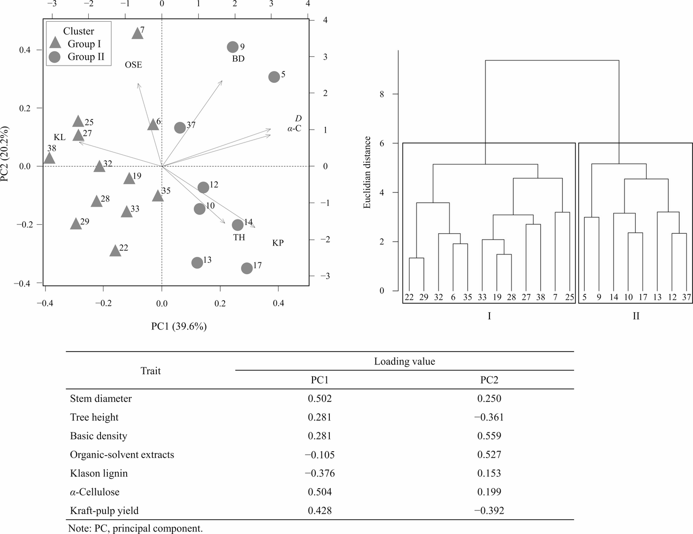 Principal component (PC) analysis scores of measured traits in 20 families, dendrogram based on the PC score, and loading values. D, stem diameter; TH, tree height; BD, basic density; OSE, organic solvent (EtOH-toluene) extracts; KL, Klason lignin; α-C, α-cellulose; KP, Kraft-pulp yield. The mean values of chemical and Kraft-pulp properties were recalculated from the mean values of the inner and outer heartwood data measurements