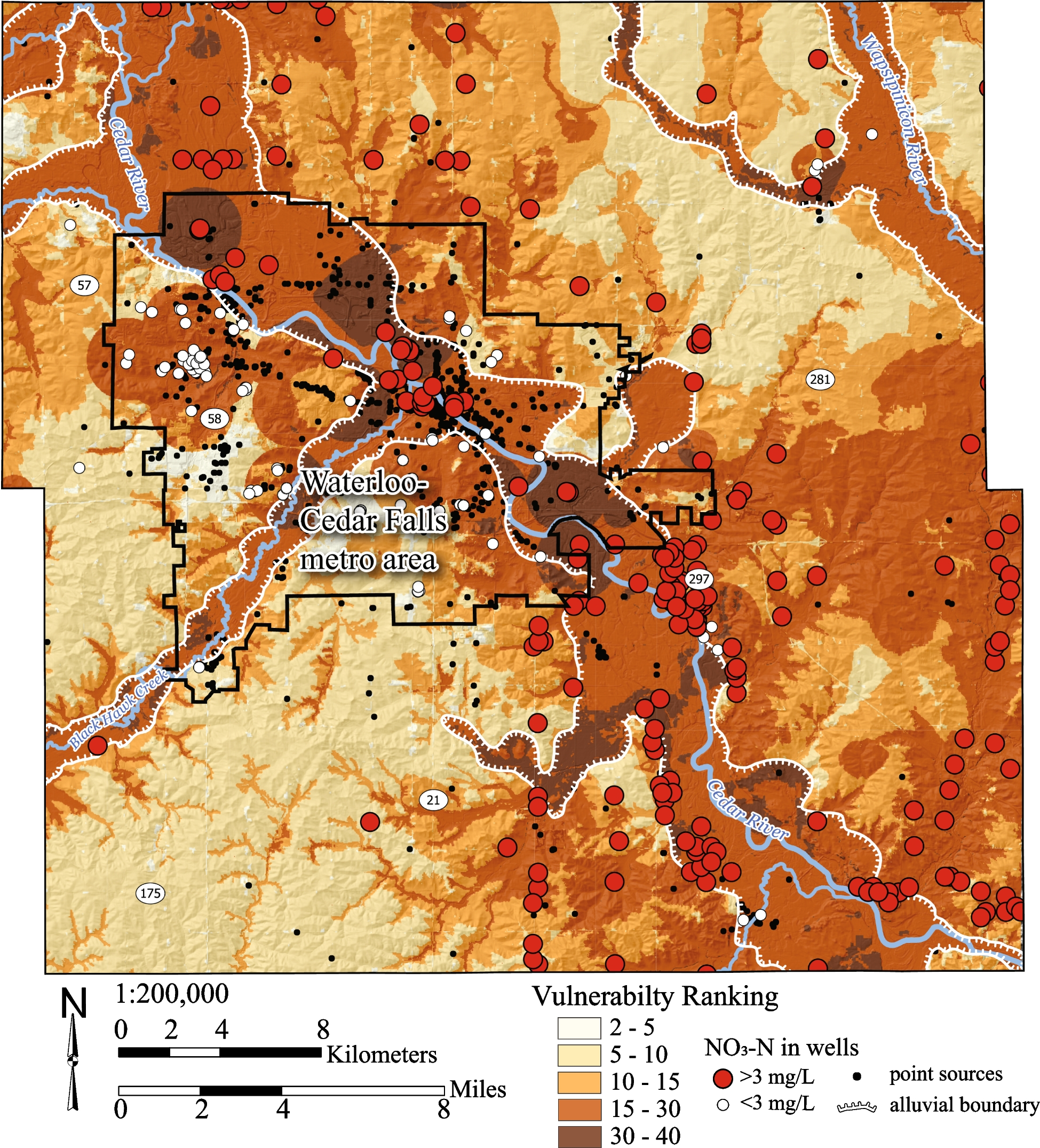 Locations of private and municipal wells in Black Hawk County with measured nitrate concentrations that are either less than 100 feet deep (private wells) or tap into unconsolidated and upper Devonian bedrock aquifers (municipal). Approximately 71.5% of the wells with nitrate concentrations > 3 mg/l are located in a cell with a vulnerability score > 20