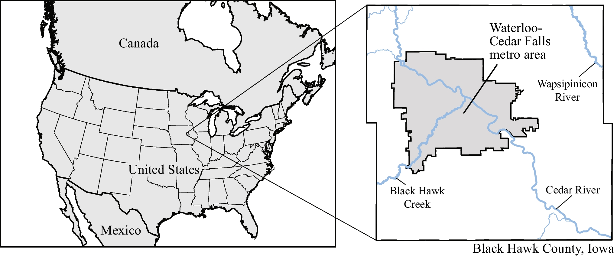 Location of Black Hawk County and major geographic features