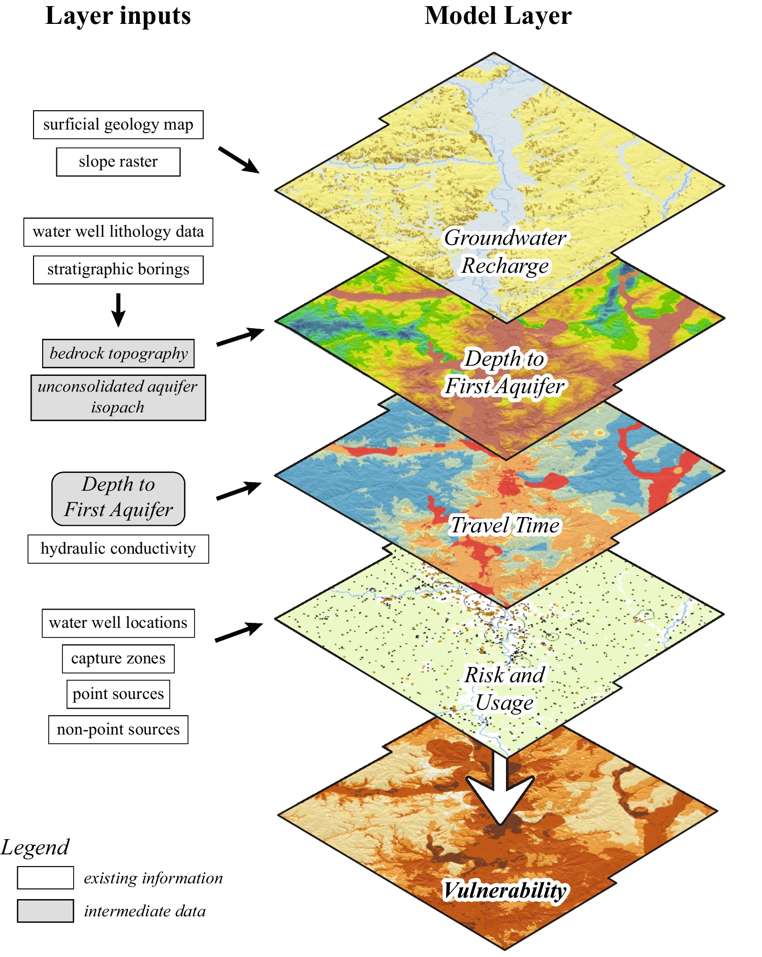 Workflow showing input information and model layers needed for the groundwater vulnerability map