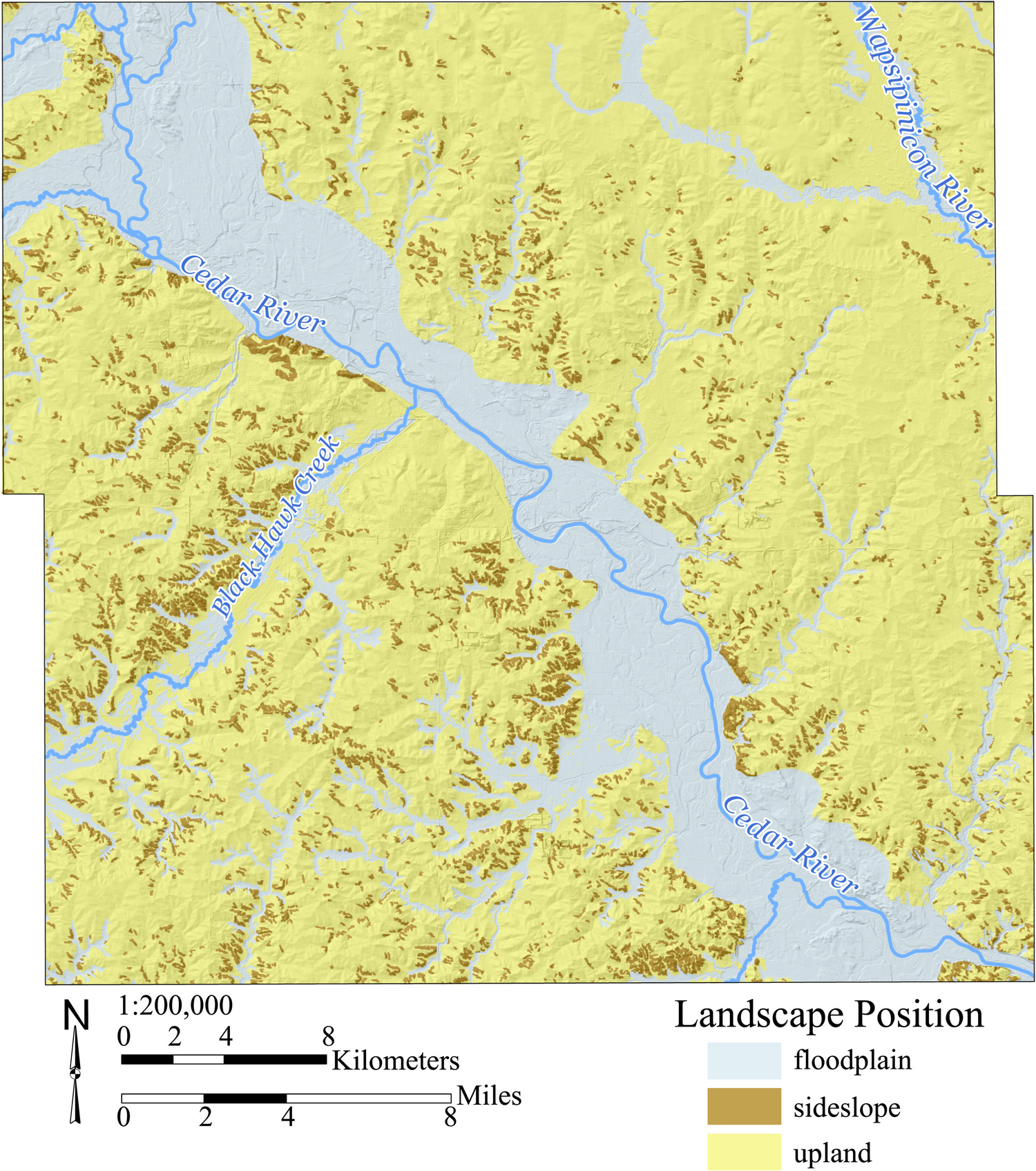 In the gently rolling and weathered glacial landscape found in Black Hawk County, much of the landscape consists of relatively flat upland divides (slopes less than 5%) and the floodplains of streams and rivers, including the dominant floodplain of the Cedar River (Fig. 4). Slopes are primarily found along the valley edges of the dissected stream network. Regional groundwater recharge would be concentrated in the floodplains where the water table is shallow (typically less than 2 m; Schilling and Jacobson 2012) and unsaturated soils consist largely of sand. Soils in upland areas typically consist of silty loess overlying oxidized till and water tables often fluctuate between 3 and 5 m below ground surface (Schilling 2009). Overall, 25.5% of the county comprises floodplains with greater recharge, compared to uplands and slopes that comprise 67.1 and 7.4% of the county, respectively.