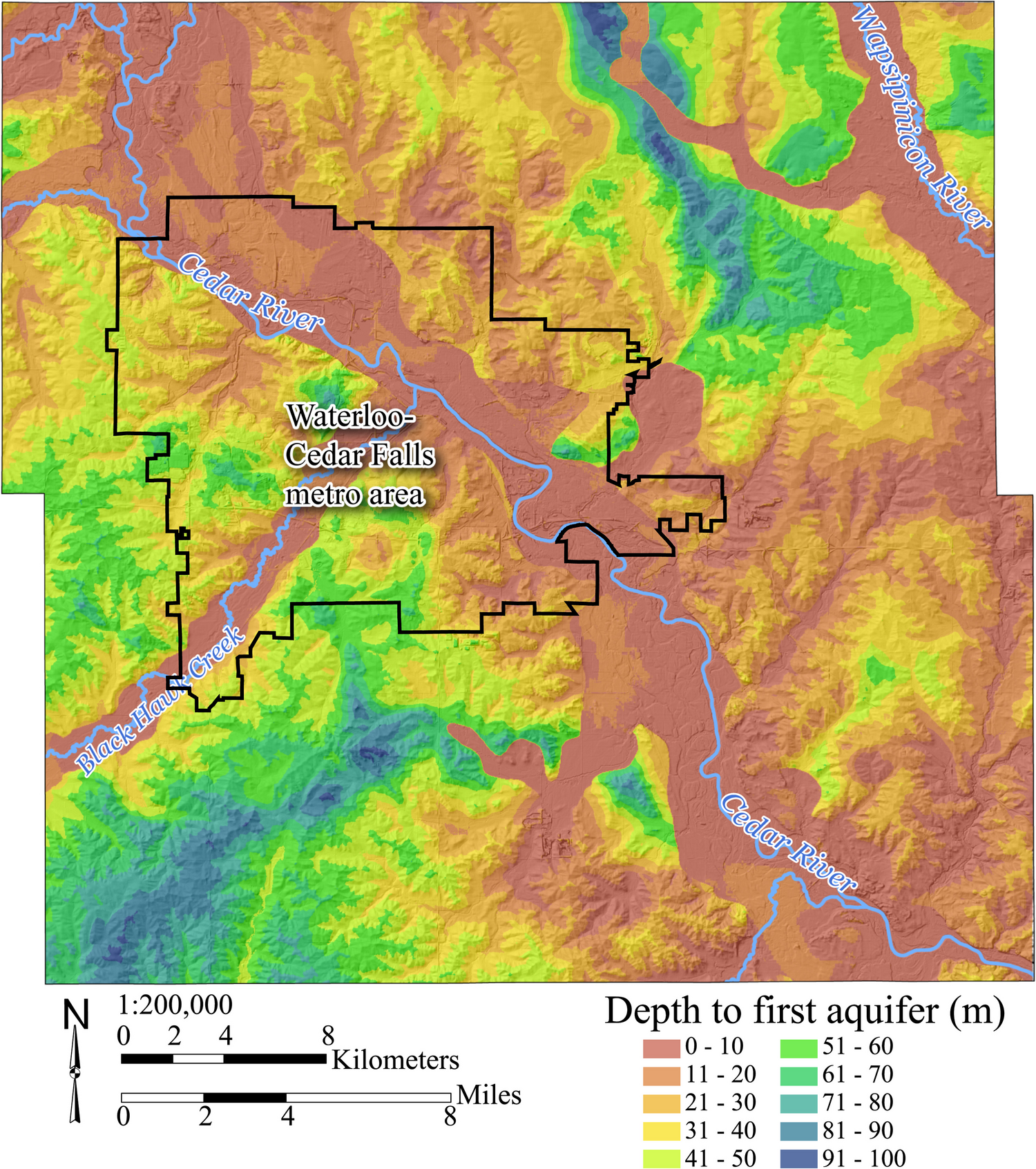 In the calculation and scoring of the time of travel time factor, a preliminary step was determining the depth to the first aquifer (Fig. 5). In Black Hawk County, principal aquifers include mainly the uppermost Silurian-Devonian bedrock or the alluvium of the Cedar River, with only scattered use of buried sand and gravel present within the glacial drift. Depth to first aquifer was typically less than 7.6–15.2 m (25–50 feet) in the floodplain corridors and in shallow bedrock areas east of the Cedar River floodplain. Regions with the greatest depth to aquifer, exceeding 61–91 m (200–300 feet), were associated with a bedrock channel that extends from the southwest portion of the county to the north and east and crosscut by the modern Cedar River (Fig. 5). Water supply and private wells still tap the Silurian-Devonian aquifer, but they draw water from a lower portion of the aquifer. Hence, there is considerably more glacial drift sitting above the aquifer in the bedrock channel areas.