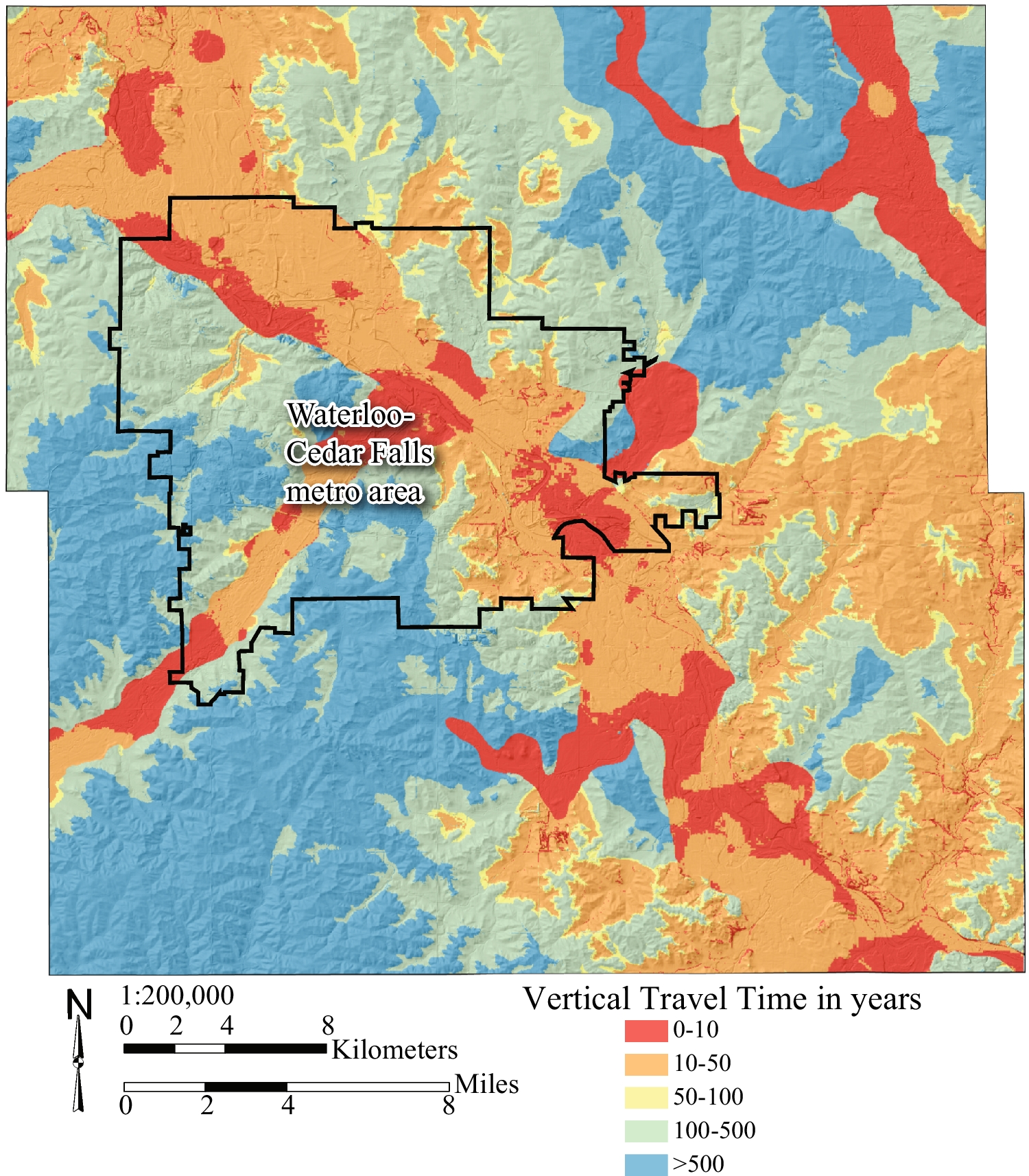 Estimated vertical groundwater travel time to the first used aquifer in Black Hawk County