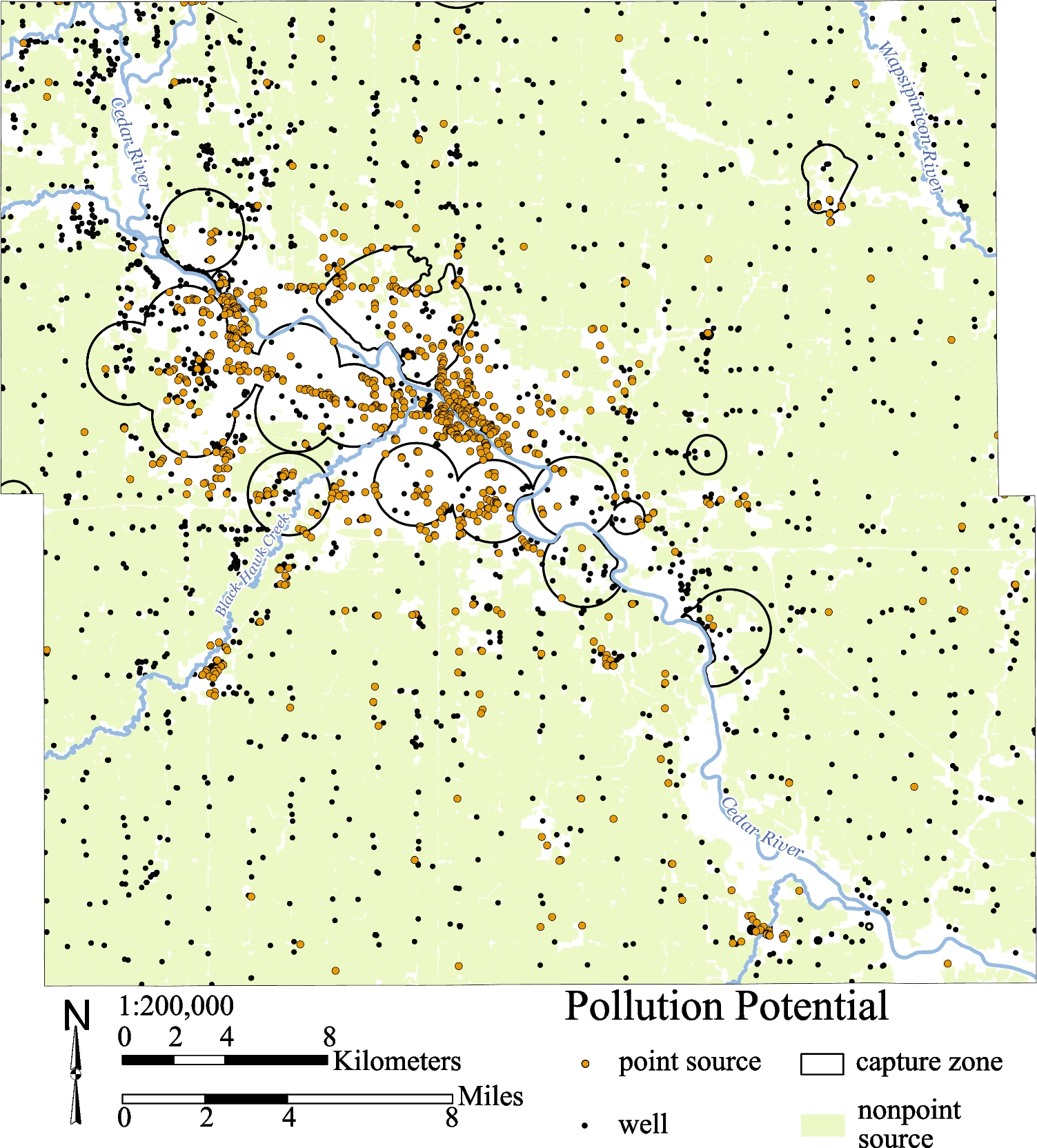 With concentrated population in the Waterloo-Cedar Falls metropolitan area, water supply systems that capture groundwater for municipal and industrial use are also located in this area (Fig. 7). Most of the capture zones are circular in shape because detailed hydrogeologic studies have not been performed to precisely delineate the zones. The circular shapes of many capture zones, as delineated by state regulators, were based primarily on the estimated hydraulic conductivity of the aquifer and the pumping rates for the wells. Larger capture zones are associated with aquifers with greater K and pumping rates. In some cases, capture zones were truncated at major rivers when the rivers were considered as a hydraulic barrier. Despite inaccuracies in capture zone delineations, greater groundwater use can be expected within these areas compared to areas without capture zones. In rural areas, nearly all farmsteads have a well but pumping rates by these wells are not particularly large. For private well sites, it was assumed that the capture zone was essentially the 30-m cell that contained the well.
