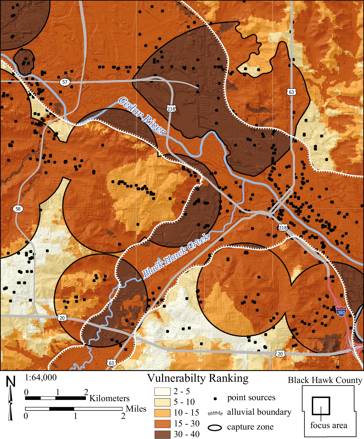 Schilling K, Wolter C, Kerr P, Tassier-Surine S, Walenceus R, Frederick H (2024) Vulnerability Rank of the First Encountered Aquifer in Black Hawk County, Iowa. Iowa Geological Survey, Open File Map OFM-24–10, 1:64,000 scale map sheets