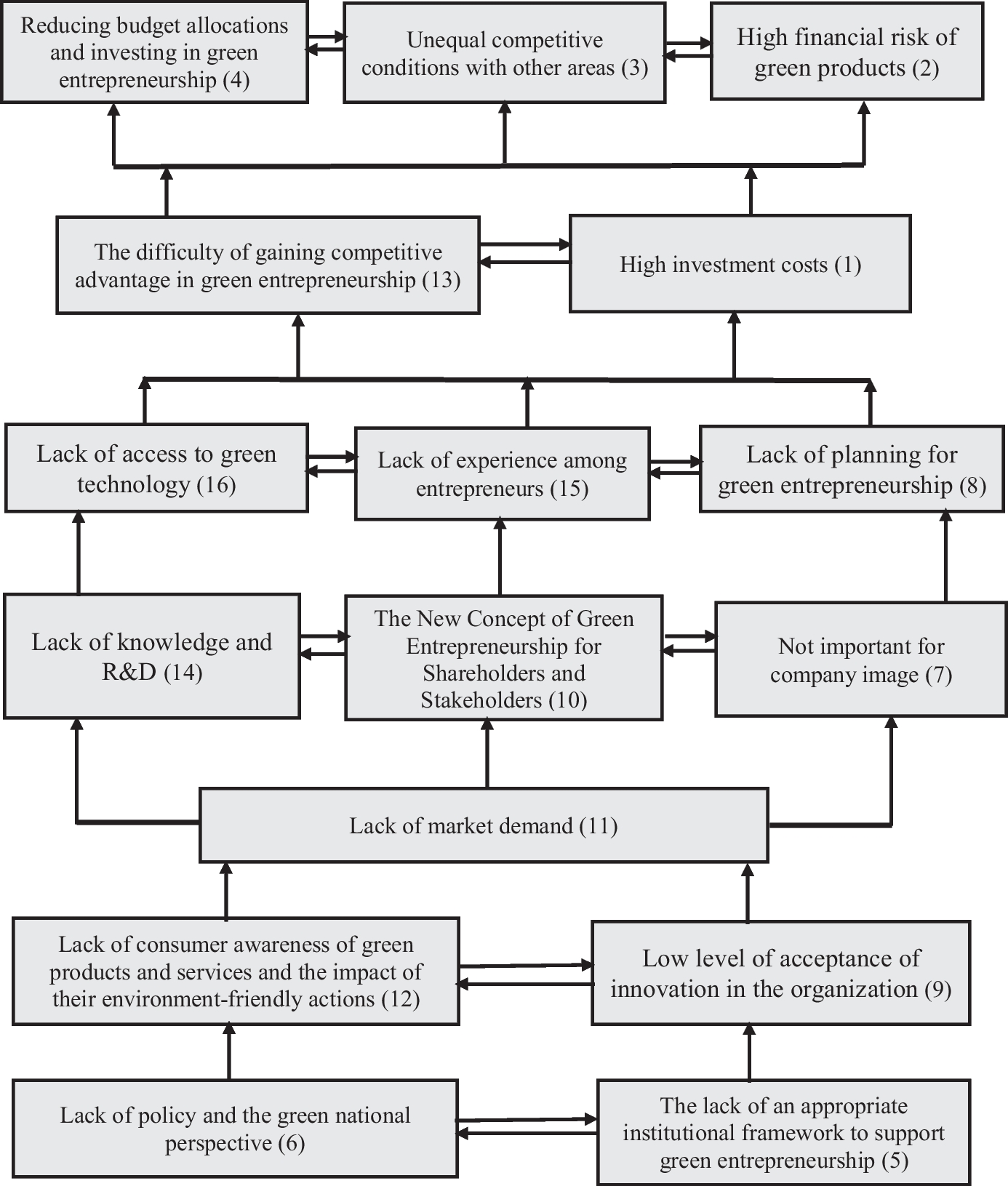 On the other hand, research in the past few years has been mostly focused on its influencing factors (Soomro et al., 2019). Also, research on the barriers to green entrepreneurship has focused mostly on one specific sector or industry (Haldar, 2019; Sher et al., 2019). In addition, the interactions and relative importance of these barriers are not clear. This paper not only explores the barriers of green entrepreneurship in a comprehensive way, barriers have also been identified from the perspective of entrepreneurs who are directly involved. As a result of these cases, this research distinguishes it from other studies in this field. Also, the number of companies that have become interested in environmental activities has increased. This research can help them make decisions and give them new insights.