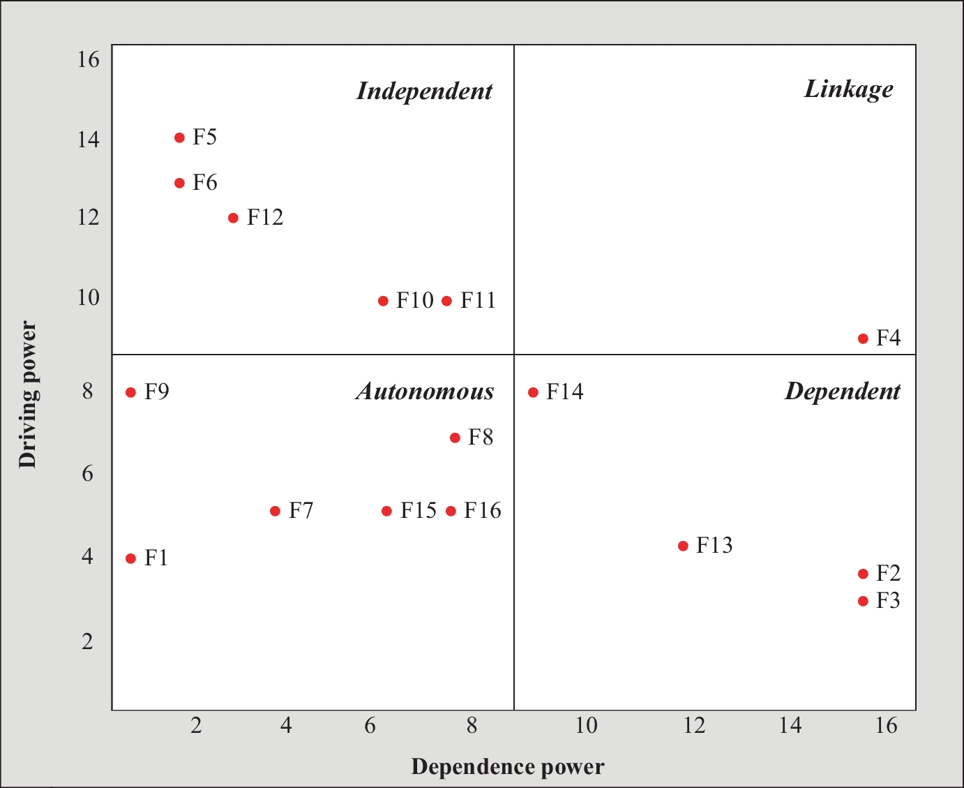 The relationships between the identified factors were then determined using ISM and, based on these relationships, the barriers were categorized using the driving power and dependence power as in four clusters. Finally, the ANP method was used to weigh the identified barriers and produce a final ranking of the barriers (shown in full in Table 8 above).