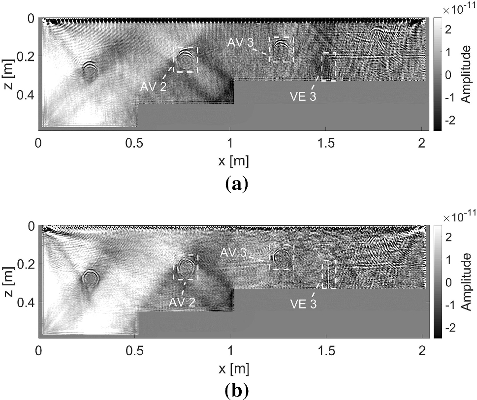 Elastic P-SV RTM results obtained using the two-step model presented in Fig. 11, after (a) cross-correlation of the z-components and after (b) cross-correlation of the x-components (AV 2: second air void, AV 3: third air void and VE 3: vertical edge of the third step)
