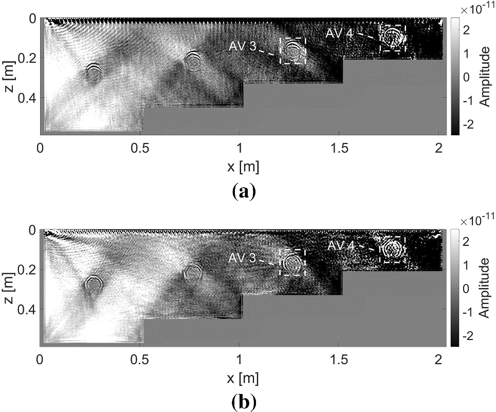 Elastic P-SV RTM results obtained using the three-step model presented in Fig. 13, after (a) cross-correlation of the z-components and after (b) cross-correlation of the x-components (AV 3: third air void and AV 4: fourth air void)