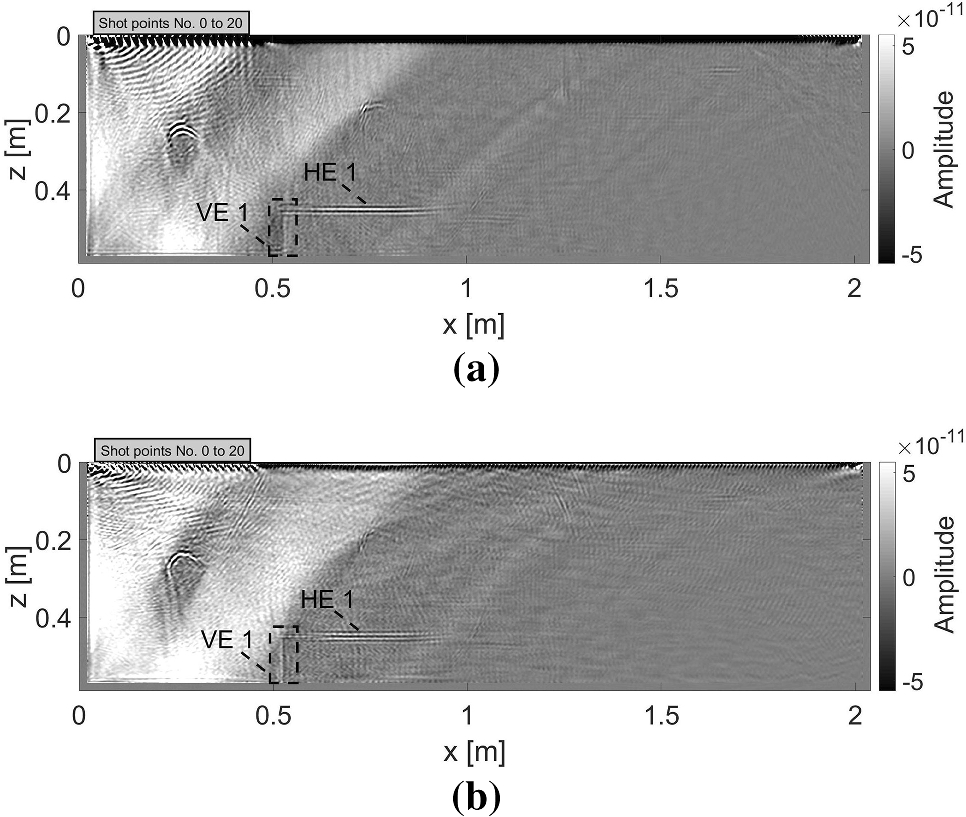 In the presented elastic RTM results obtained after cross-correlation of the z-components (Fig. 8a, 10a, 12a), the vertical step edges are indicated with weak amplitudes. We were able to improve the mapping of these vertical reflectors by stacking only the migration images of specific shot points. Figure 15 demonstrates the selective stacking result exemplarily for the first RTM evaluation (Fig. 8). Only the migration images of shot points No. 0 to 20 were summed up. Compared to the RTM result presented in Fig. 8a, the vertical step edge (marked with VE 1) is now clearly visible in the cross-correlation result of the z-components. Furthermore, in the cross-correlation result of the x-components, the reconstruction quality of the vertical step edge (marked with VE 1) could be enhanced compared to the RTM result depicted in Fig. 8b. In both RTM images, mapping of the horizontal edge of the first step (marked with HE 1) could be improved as well. Hence, stacking migration images of selected shot points can enhance the imaging of certain reflectors as it minimizes the noise [40, 41].
