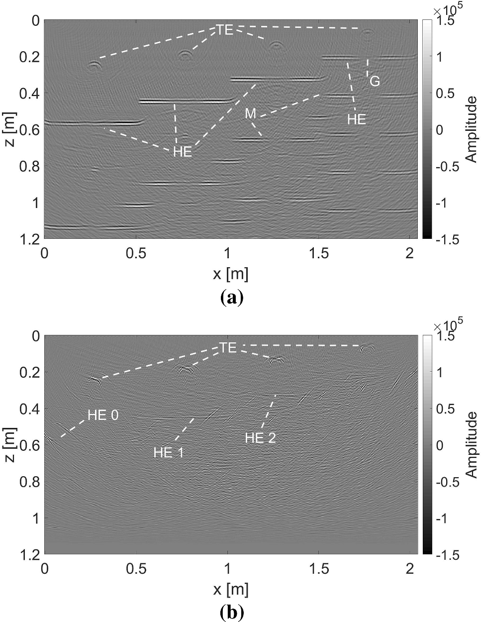 In the obtained SAFT-reconstruction of the z-components (Fig. 16a), the lower boundary of the concrete layer at \(z = 0.57\) m and the edges of the steps running parallel to the top edge of the model are clearly visible (marked with HE). Furthermore the top edges of the four air inclusions were imaged successfully (marked with TE). The edge of the third step shows a gap directly below the fourth air void (marked with G) and was not imaged continuously because, a more complex wavefield is generated in this region of the model. Migration artefacts due to multiple reflections in the synthetic data are clearly visible (marked exemplarily with M). In the SAFT result of the x-components (Fig. 16b), the top edges of the air inclusions were imaged (marked with TE). The edges of the first (marked with HE 1) and second (marked with HE 2) step running parallel to the top edge of the model are partially reproduced. The lower boundary of the concrete layer at z = 0.57 m (marked with HE 0) is indicated with a weak amplitude.