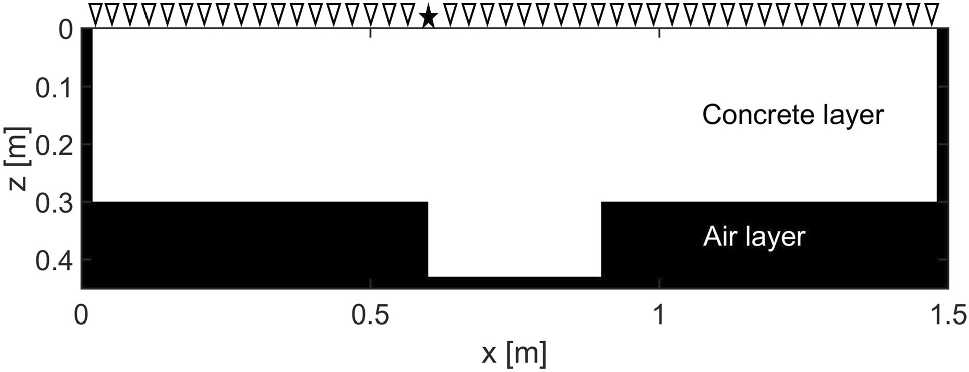 2D concrete-air model. As an example, the position of shot point No. 28 is marked with a black star and the receiver positions are indicated with triangles