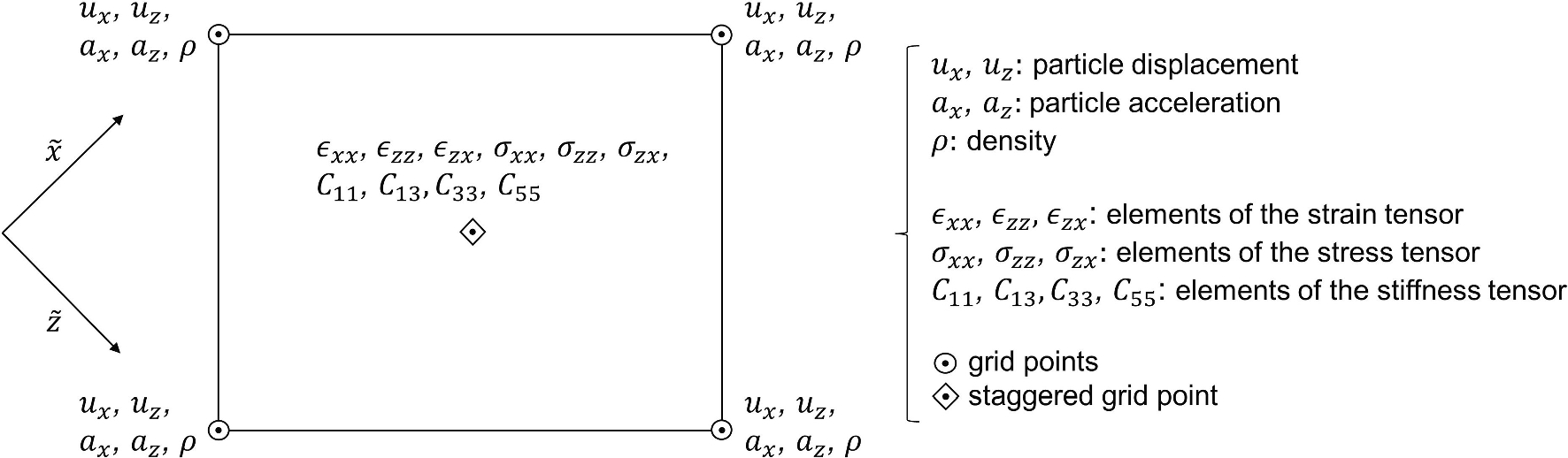 Compared to the temporal derivatives calculated with the second-order finite difference scheme, the spatial derivatives in 2 and 4 are calculated with eighth-order RSG finite difference schemes. Figure 3 shows the coordinate system of the RSG and the locations where the material parameters or variables are defined or rather calculated. The directions of the spatial derivatives have changed to \(\tilde{x}\) and \(\tilde{z}\) [61].