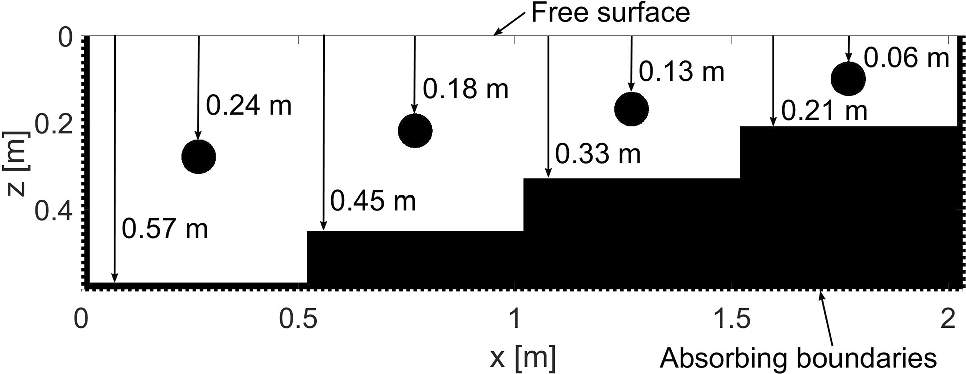 For the generation of the synthetic elastic P-SV ultrasonic data, we defined a 2D numerical concrete model which corresponds in its geometry to one of our laboratory specimens. More details on this specimen can be found in Reinhardt [64]. Our 2D model consists of a three-step homogeneous concrete layer surrounded by a 0.02 m thick layer of air at the sides and lower edge. The model is 2.04 m wide and 0.59 m deep. Four circular air voids with a diameter of 0.08 m are integrated into the concrete layer at different depths. The different thicknesses of the concrete layer as well as the depths of the air voids are shown in Fig. 4. Table 1 summarizes the material parameters used for modeling. We used a density value of 150 \(kg/m^3\) for concrete instead of the correct value of 2400 \(kg/m^3\). Using the true density value caused instability problems of the elastic simulations because, the elastic P-SV finite difference algorithm used here does not perform arithmetic averaging of the density, which is essential for stable simulation results at interfaces with large impedance contrasts [65]. By using an elastic P-SV RTM routine available at the Technical University Freiberg, we performed synthetic RTM evaluations on a small numerical concrete-air test model, each with a density value for concrete of 150 \(kg/m^3\) and 2400 \(kg/m^3\). A comparison of the two elastic P-SV RTM results showed no significant difference in the amplitudes. Hence, using a density value of 150 \(kg/m^3\) for concrete is a valid approximation.