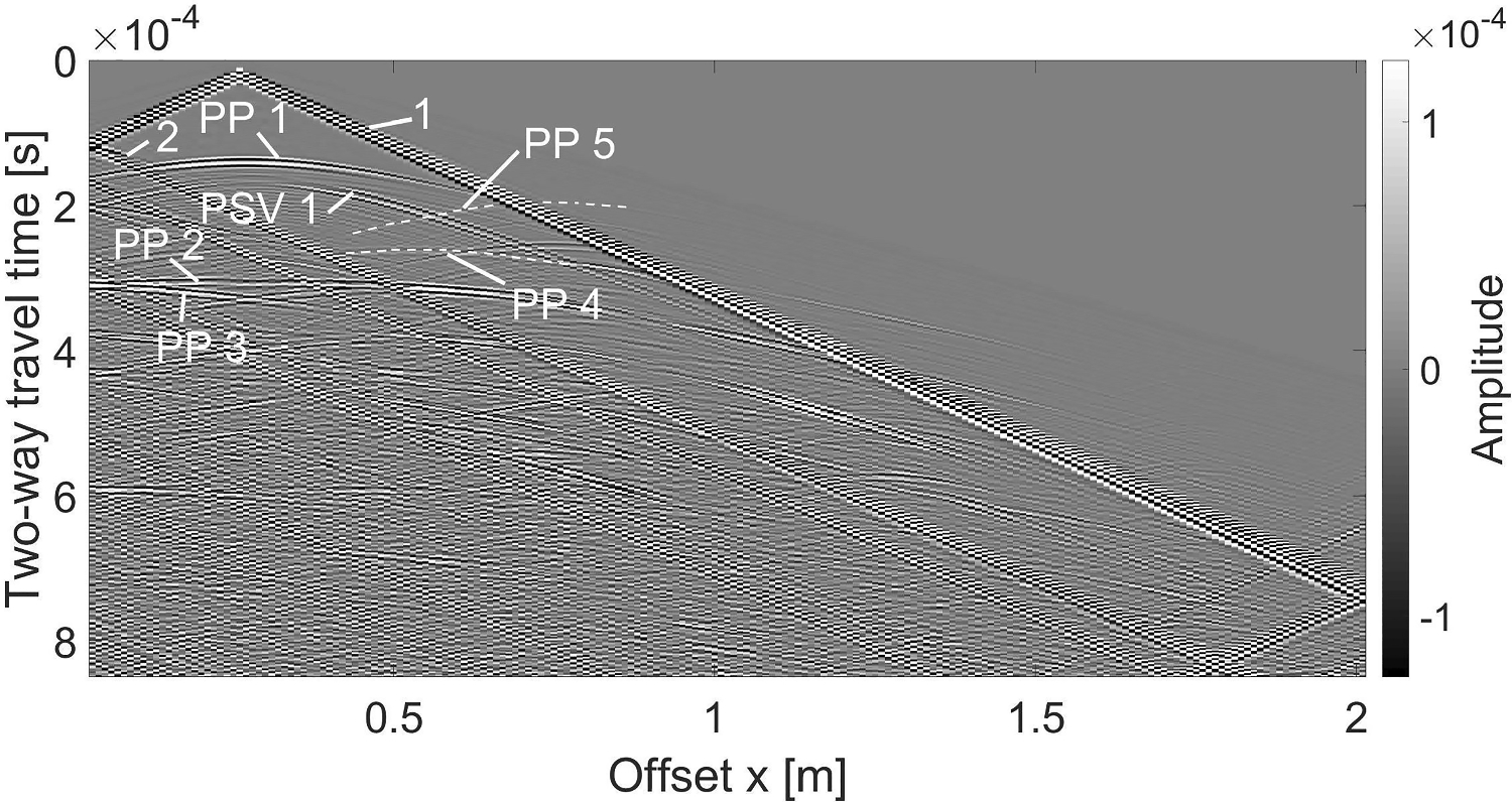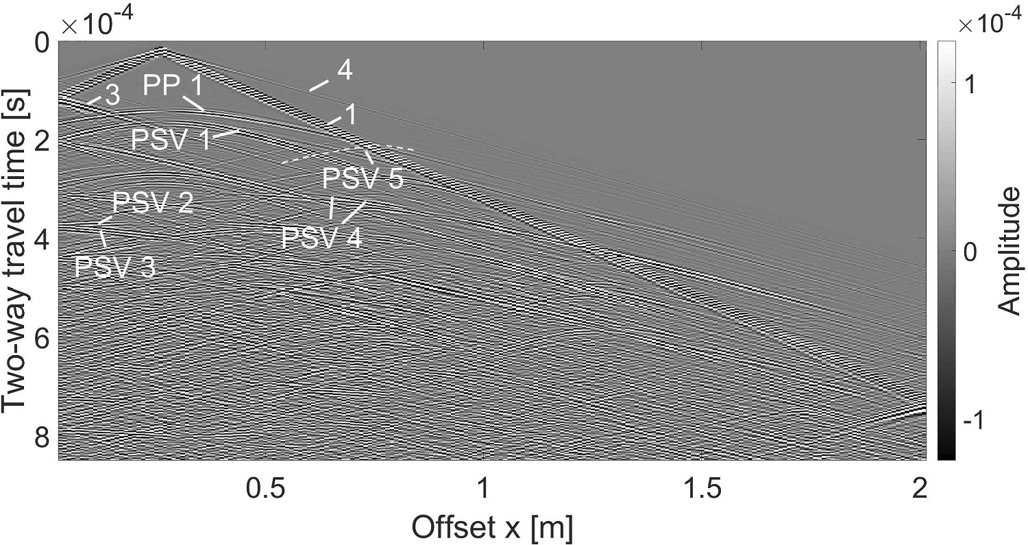 Fig. 5 and Fig. 6 exemplarily show elastic synthetic P-SV data for source position No. 11 located at x = 0.26 m above the first air void. The amplitudes of the z- and x-component of acceleration are shown and essential wave events are marked accordingly. For example, the direct R-wave (1) can be clearly seen. Part of the direct R-wave (1) is reflected at the left upper edge of the concrete layer, resulting in an R-wave propagating back along the surface (2) as well as a mode converted bulk wave (3), among others. Furthermore, a head wave (4) guided by the P-wave is formed, which has a weak amplitude. At the first air void, a part of the incident P-wave is reflected as a P-Wave (PP 1) as well as a converted SV-wave (PSV 1). These events are visible in the form of reflection hyperbolas. In addition, the events highlighted with PP 2 and PSV 2 mark the reflected P-wave and the converted SV-wave arising from the P-wave reflection at the lower boundary of the concrete layer. Moreover, the reflected P-wave (PP 3) and converted SV-wave (PSV 3) from P-wave reflection at the lower left edge of the concrete layer are recognizably in the data. Further on, reflection events of the incident P-wave at the corner of the first step can be clearly seen: a reflected P-wave (PP 4) and a mode converted SV-wave (PSV 4). Reflection hyperbolas caused by a reflected P-wave (PP 5) and a converted SV-wave (PSV 5) resulting from P-wave reflection at the second air void are visible with weak amplitudes in the data.