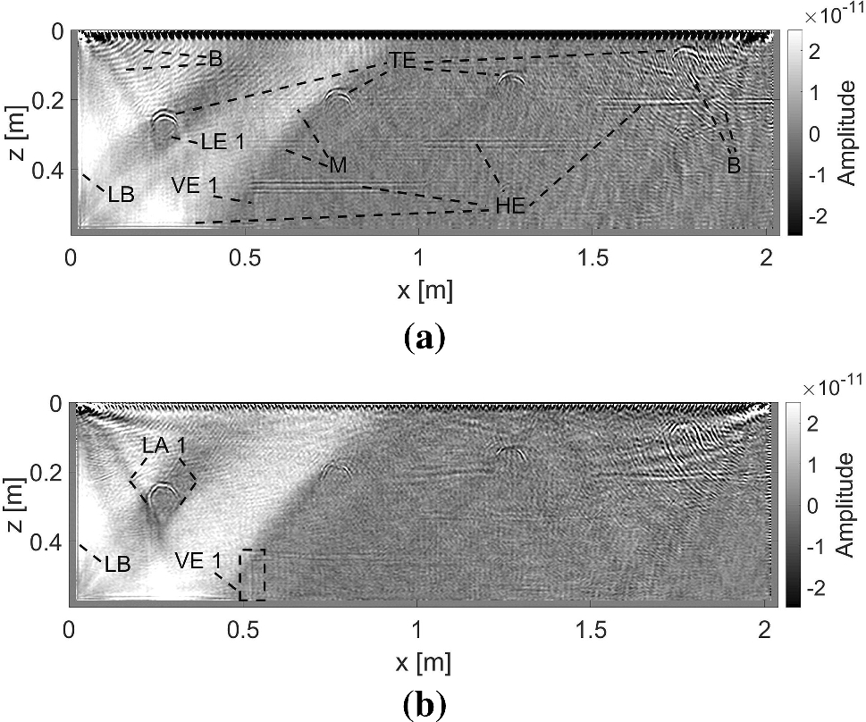 Elastic P-SV RTM results obtained using the migration model presented in Fig. 7, after (a) cross-correlation of the z-components and after (b) cross-correlation of the x-components (TE: top edges of the four air voids, LE 1: part of the lower edge of the first air void, HE: horizontal edges of the concrete layer, VE 1: vertical edge of the first step, LB: left lateral boundary of the concrete layer, LA 1: lateral edges of the first air void, B and M: migration artefacts (marked exemplarily))