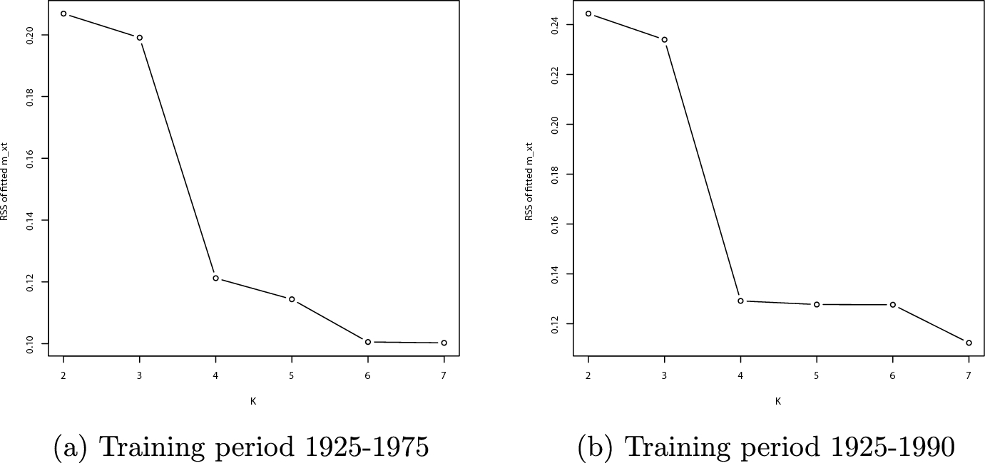 We considered the correct number of subgroups empirically, as well. Figure 1 below shows that the training error decreased with increasing K and that values greater than 4 provide little additional benefit. More specifically, Fig. 1 gives the plot of training RSS of \(m_{xt}\) as the value of K increases for training periods 1925–1975 and 1925–1990, i.e., the shortest and the longest training periods applied in the rolling-window cross-validation tests in Sect. 3.1. Both cases show a clear “elbow” at \(K=4\).