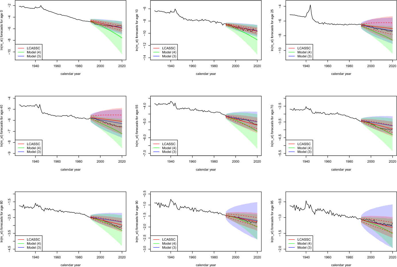 By considering correlation among time factors and mortality structural changes, permanent or recurring, the LCASSC model provides excellent forecast accuracy and strong estimation of forecast uncertainty for both short-term and long-term horizons (Sect. 3.1). It has the lowest average MSEs among the four models compared for all forecast horizons considered from short to long. When training on data in 1925–1990 and testing on 1- to 30-year forecasts for ages {0, 10, 25, 40, 55, 70, 80, 90, 95}, it gives 95% prediction intervals of mortality that successfully cover almost all the observed data (269 out of 270) and that have the narrowest width among the three models that apply the same time factors (Sect. 3.2). Moreover, since LCASSC models recurring structural changes by MSBVAR and permanent structural changes, it gives insightful quantitative information about those changes (Sect. 3.3).