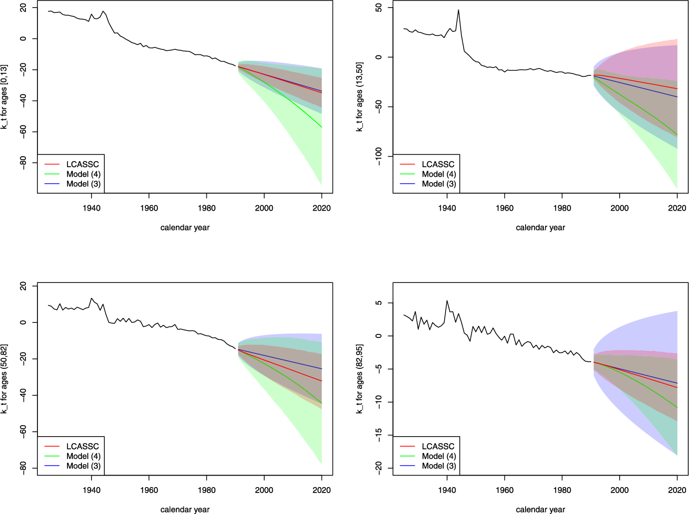 Shi et al. [36], on the other hand, explicitly incorporate mean-reversion into their multi-population model. This is natural, important, and relatively simple when considering separate populations within one model. One does not want the mortality pattern for 50-year-olds in one country to diverge from that of 50-year-olds in another country, especially if those countries are similar culturally and economically and are geographically close. On the other hand, the LCASSC model does not create series for different populations that include people of the same ages, but rather creates series for subgroups of a single population formed by partitioning the various age ranges. We expect more divergence in behavior for these groups, and mean-reversion seems less natural in this context.