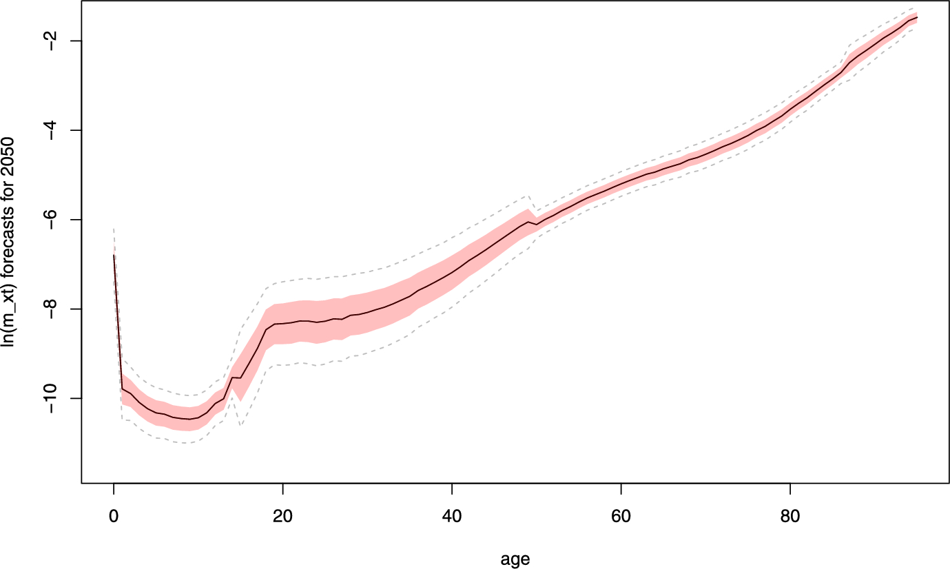 However, we notice that in Fig. 4, the forecast of \(\ln {m_{x,t}}\) in 2050 and the corresponding prediction intervals show discontinuity at the separating age points of the four age subgroups. In future study, we would like to extend this model and carefully consider the projections of the time factors near the separating ages, so that it would provide a smoother mortality forecast across ages. Alternative future work would refine the model to incorporate a mechanism to increase coherence between the age group series (i.e., cointegration, mean-reversion, etc.) while preserving the ability for any individual age group to experience structural change.