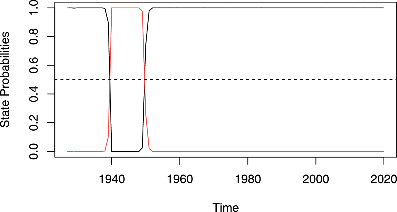 Fitted state probabilities from two-regime MSBVAR(1) for \(\Delta (\kappa _r^k)_t\) during 1925–2020. The black curve expresses the state probability of regime 1 while the red curve expresses the state probability of regime 2