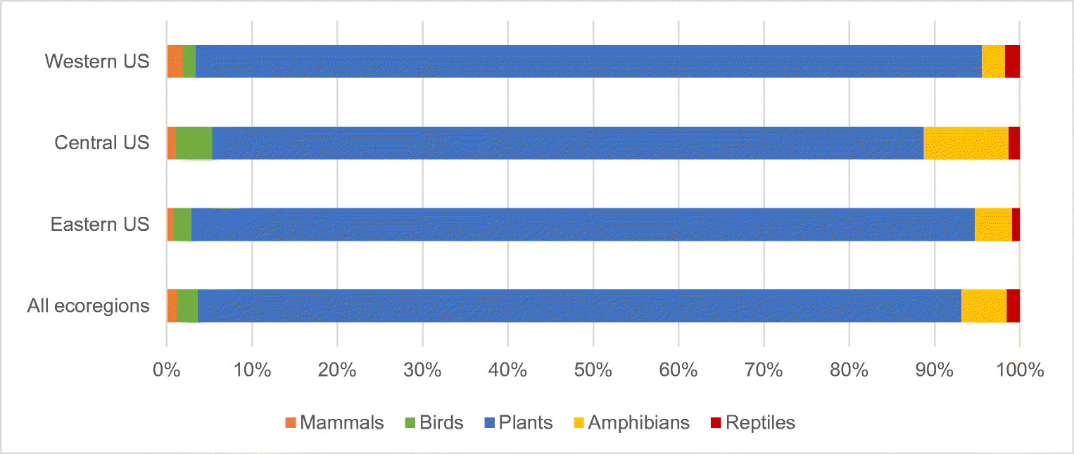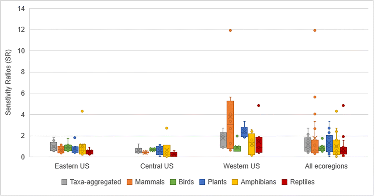 Central and eastern ecoregions showed less sensitivity to species across taxonomic groups and ecoregions.