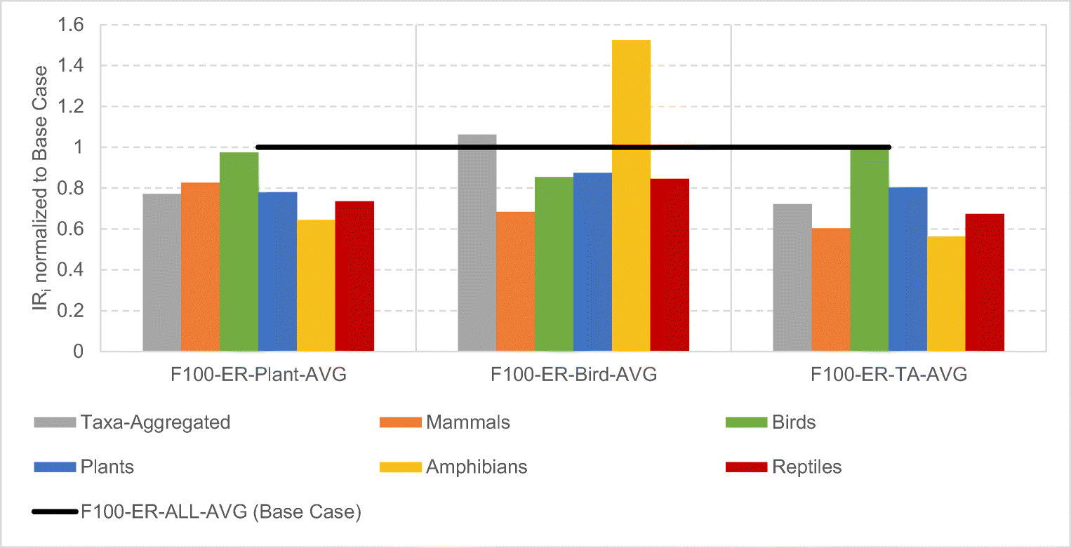 As discussed above, the application of the CFs from Chaudhary et al. (2015) yielded the following results: plants were shown to be especially affected by forest management, and forest management was shown to have a variable effect on different taxonomic groups within different ecoregions. We used these results to define and assess potential fiber sourcing improvement opportunities. Moving fiber sourcing to ecoregions with less sensitivity to the taxa-aggregated indicator led to the greatest average improvement on calculated indicator scores (see Fig. 3). Bird species were the least improved when managing for plants or to improve the taxa-aggregated indicator. In contrast, moving fiber sourcing to ecoregions where birds were less sensitive to forest management seemed to have less of an effect on the other taxonomic groups, except for the negative effects on amphibians. This result may be explained by the fact that we moved a significant portion of fiber sourcing to NA0403, a region where amphibians were shown to be highly sensitive to forest management. We cannot conclude from these limited results that there will consistently be a tradeoff between birds and amphibians.