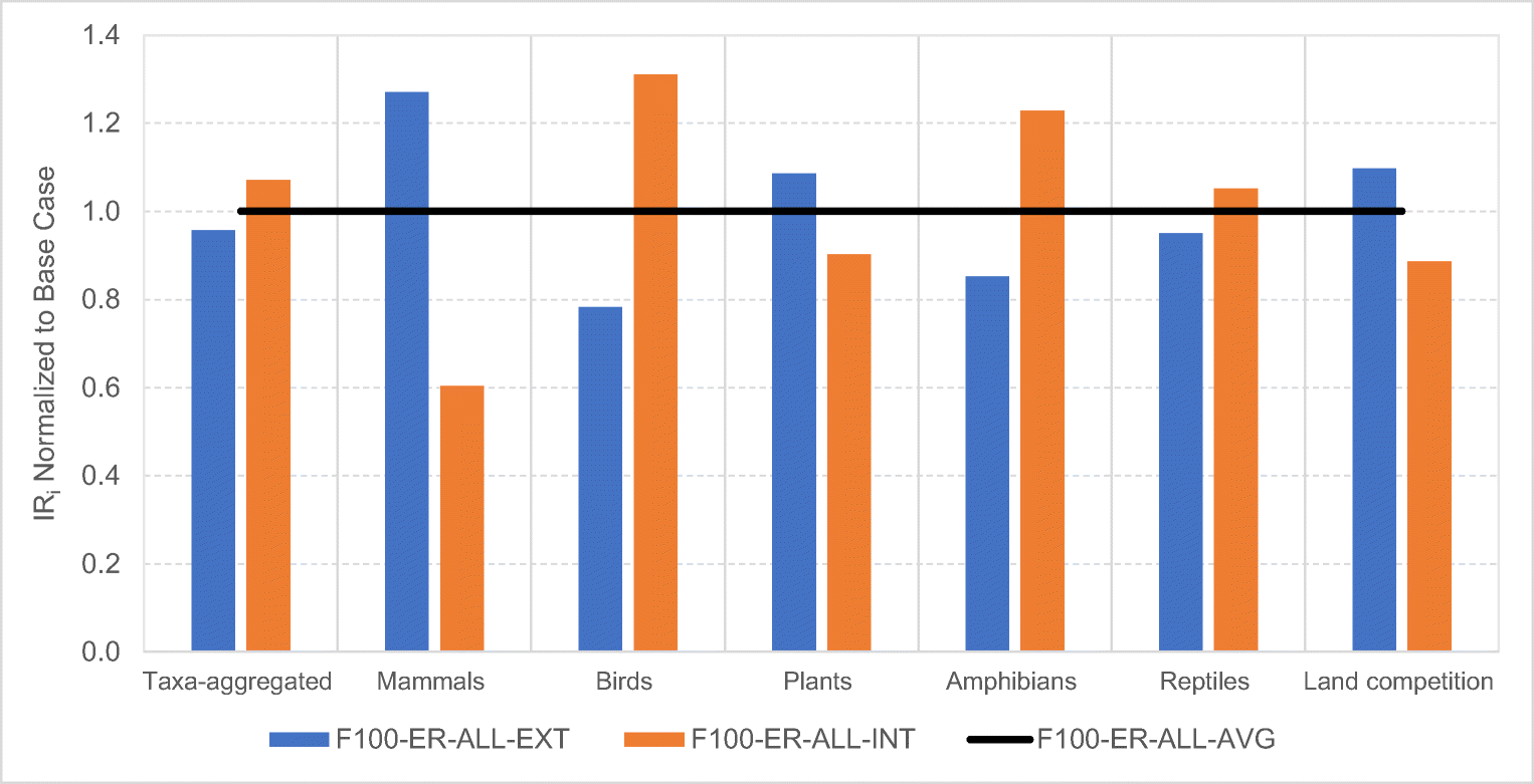 Altering intensity of management from an US-average level (as computed in the US LCI database for the various regions) to exclusively extensive (F100-ER-ALL-EXT) or exclusively intensive (F100-ER-ALL-INT) management had several outcomes (Fig. 5).