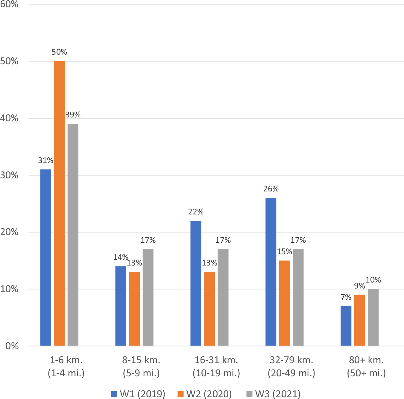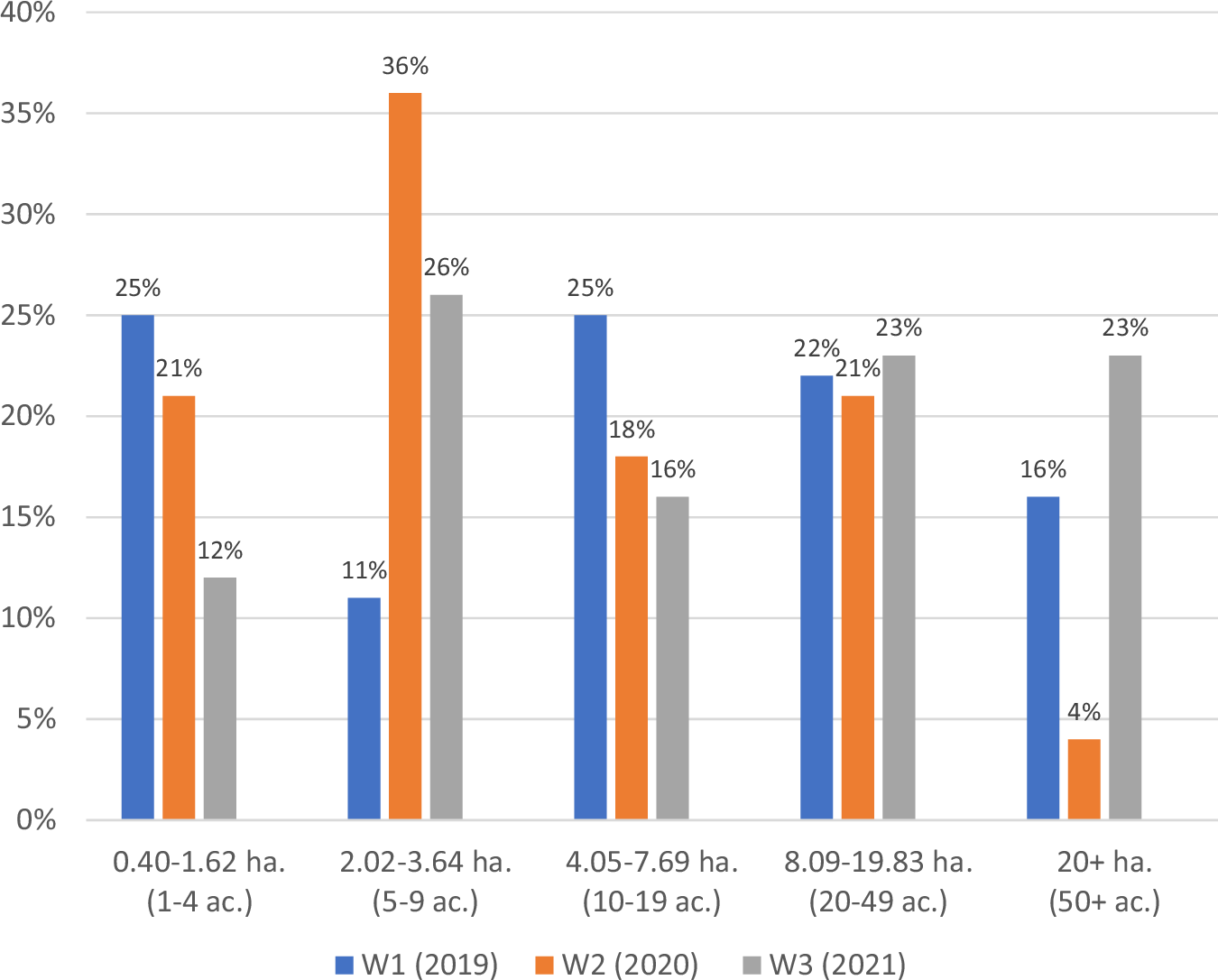 Most participants (70%) reported conducting trail work with at least one partner in 2019 (Wave 1); this proportion dropped to less than half (43%) in 2020 (Wave 2) and then rebounded to about two-thirds (65%) in 2021 (Wave 3). Similarly, the average amount of trail work completed with partners dipped from 16.09 km (10 miles) on average in 2019 (Wave 1) to 11.27 km (7 miles) in 2020 (Wave 2) and then rebounded to 14.48 km (9 miles) on average in 2021 (Wave 3), see Table 2. The average trail project size was influenced by changes in the scale of trail projects that land management personnel partnered with external entities on during the study period. In 2019 (Wave 1), less than a third of the sample reported that trail projects were 1–6 kilometers (1–4 miles) in scope; that proportion grew to 50% in 2020 (Wave 2) and then dropped back to 39% in 2021 (Wave 3). Conversely, there was a smaller proportion of projects sized 8–15 km (5–9 miles), 16–31 km (10–19 miles), and 32–79 km (20–49 miles) during the pandemic year, 2020 (Wave 2) when compared to pre- and post-pandemic years, 2019 (Wave 1) and 2021 (Wave 3) respectively, see Fig. 1.
