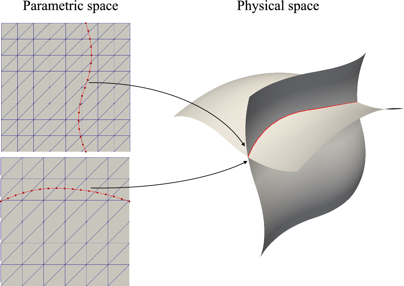 A pair of shell patches share one surface–surface intersection in the physical space, associated parametric surfaces are illustrated. A topologically 1D, geometrically 2D quadrature mesh (red interval mesh) is created in the parametric space and moved to parametric locations of the intersection with respect to two shells to create transfer matrices. Geometric and displacement quantities of shell patches are interpolated to the quadrature mesh, where the penalty energy is integrated