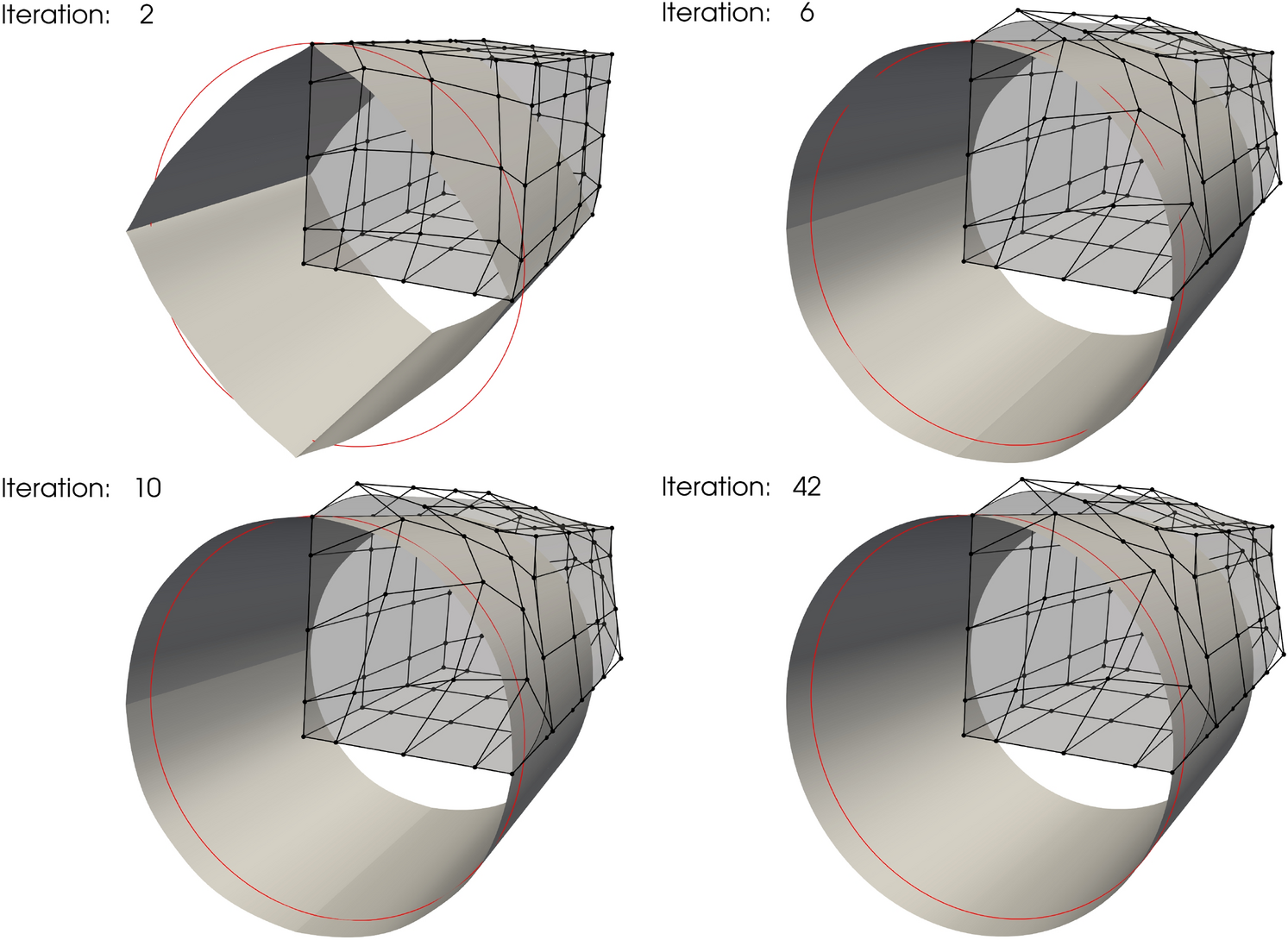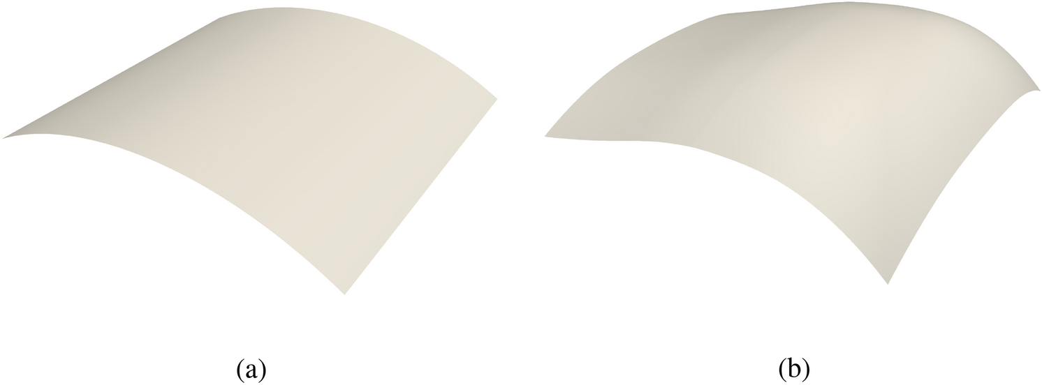 While the Kirchhoff–Love shell theory neglects transverse shear strains, membrane locking can still occur in cases of curved geometry. In our current implementation, we use the standard Gauss quadrature rule to perform numerical integration without including special treatment to avoid membrane locking. We have conducted numerical studies in our earlier work [44, Section 4] to assess the accuracy and convergence of the framework for a series of benchmark problems. Solutions converge quickly to the reference solution with increased refinement, particularly evident for cubic NURBS surfaces, which are utilized in the numerical examples and applications in Sects. 5 and 6. Nevertheless, incorporating methods to alleviate potential membrane locking in isogeometric Kirchhoff–Love shells into our open-source framework will be an appealing research topic in future. We refer readers who are interested in techniques for removing membrane locking to [51‐58].