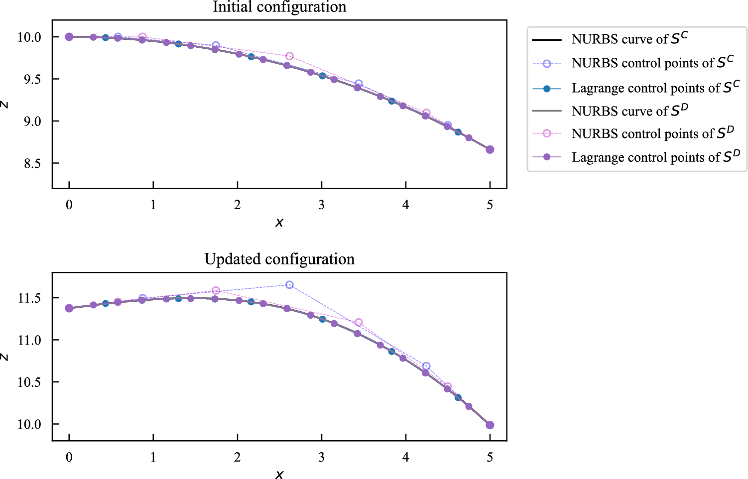 Practical complex shell structures typically consist of multiple NURBS patches. For example, a pair of intersecting shells joined at a certain angle, which is prevalent when modeling the stiffeners of an aircraft wing, cannot be described by one NURBS surface. To make the CAD geometry directly available for IGA, separate NURBS patches need to be coupled together so that both displacement continuity and joint angle conservation on the surface–surface intersections are maintained during deformation.